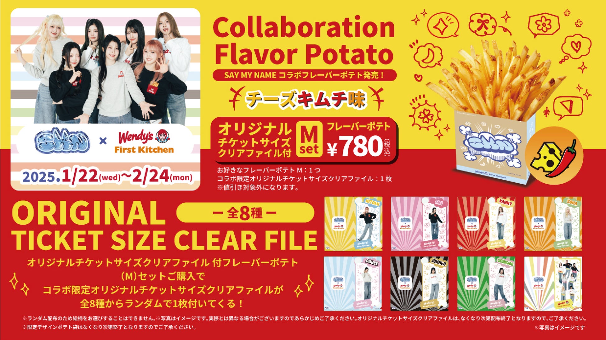 ウェンディーズ·ジャパン株式会社及び、ファーストキッチン株式会社は1月22日(水)より、ウェンディーズ· ファーストキッチンとファーストキッチン(競馬場店を除く)で、日韓で活躍するJAEJOONG(ジェジュン)がプロデュースする7人組のガールズグループ『SAY MY NAME』(セイマイネーム)とのコラボキャンペーンを開催します。コラボを記念して、フレーバーポテト「チーズキムチ味」を販売します。さらに『SAY MY NAME』各メンバーを撮り下ろしした、オリジナルチケットサイズクリアファイル(全8種)とお好きなフレーバーポテトMセット780円(税込)を2月24日(月)までの期間中、数量限定で販売します。数に限りがありますのでお早めにご来店ください。また、4店舗限定で店内装飾を実施します。ぜひ『SAY MY NAME』の世界観をお楽しみください。