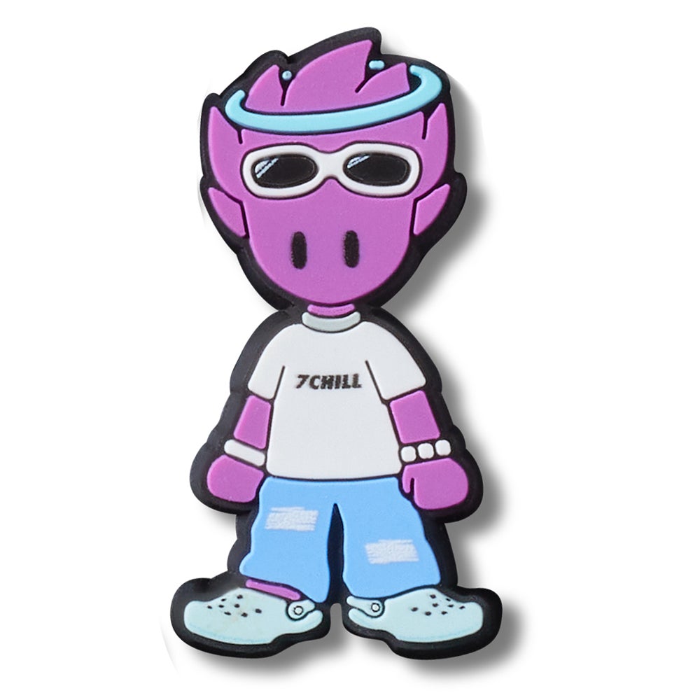 紫色やサングラスブレスレットでアクセントを加えたデザイン。Tシャツの「7CHILL」と風になびく髪型で、情熱的なチェ・ヒョンソクの姿を表現しています。