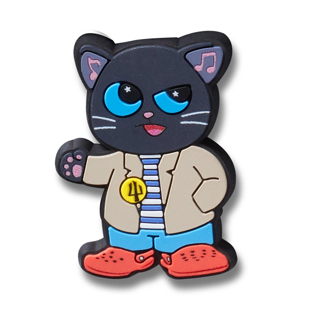 ヨシの好きなストライプ柄と赤いクロッグでルックを演出。猫耳の音符や手のひらのデザインが可愛らしく、トップスのバッジにはシグネチャー「Y」が刻まれています。