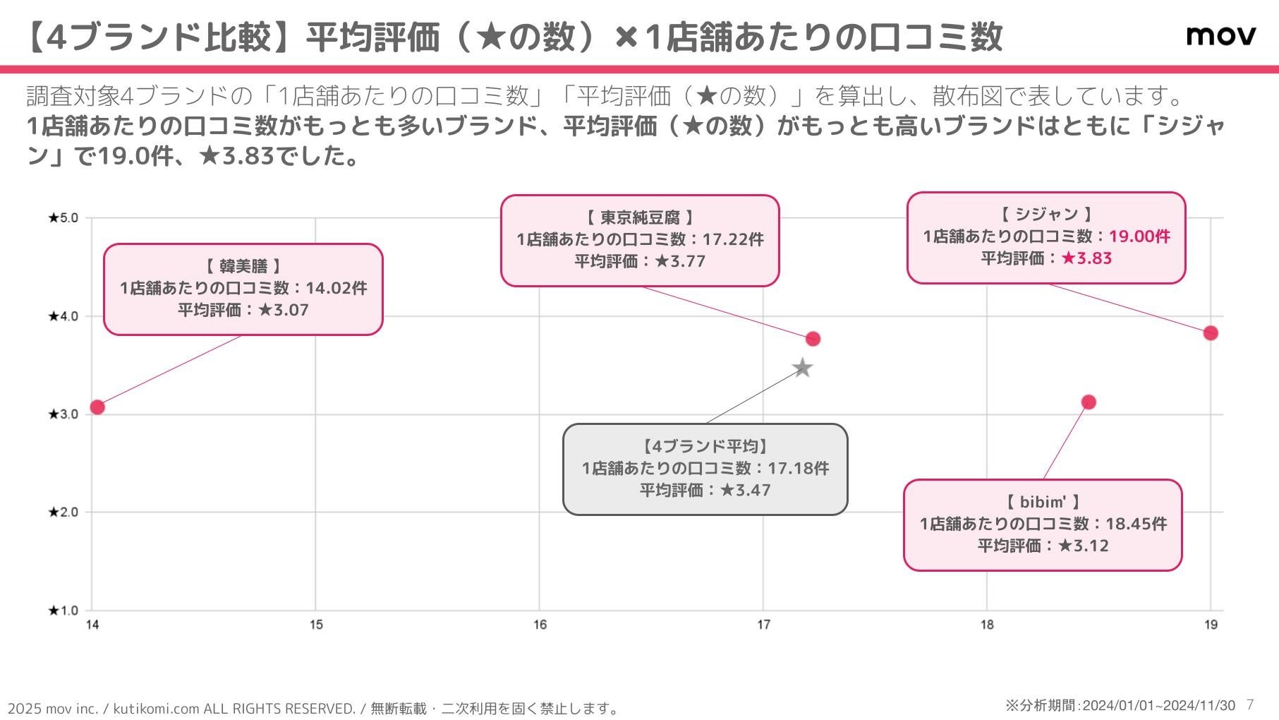 こちらの散布図では、調査対象4ブランドの「1店舗あたりの口コミ数」「平均評価(★の数)」を算出しています。