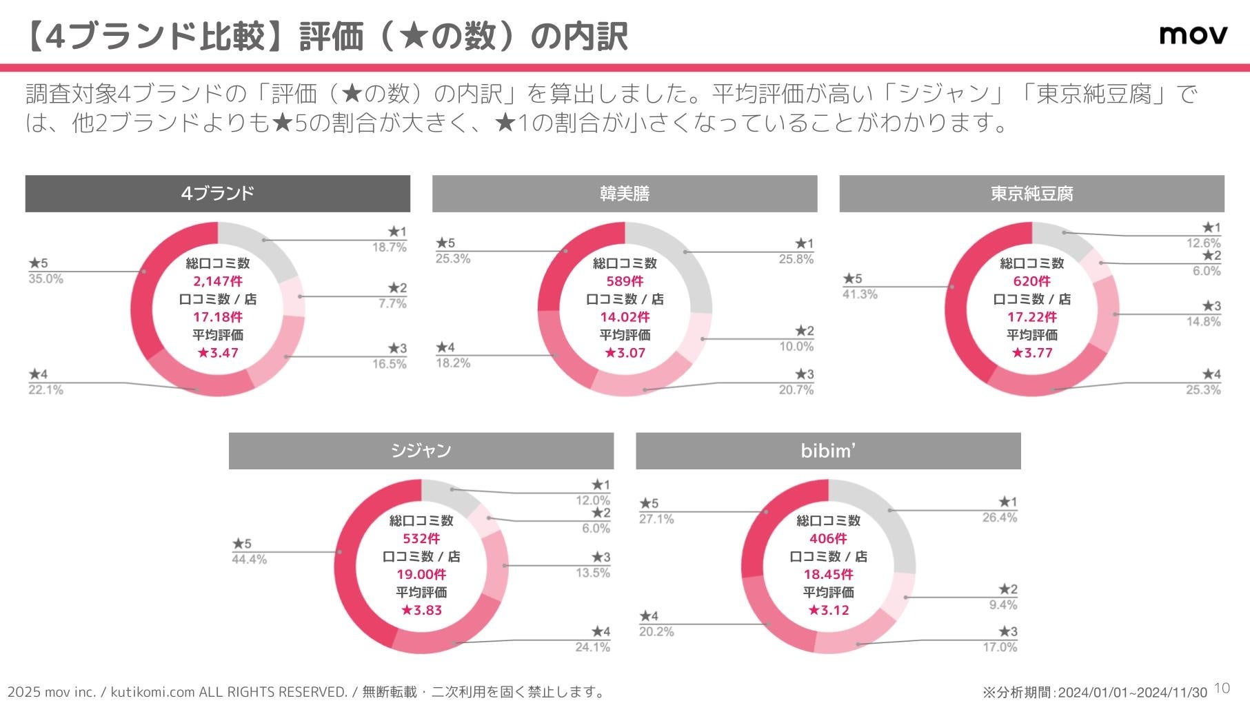 こちらのグラフでは、調査対象4ブランドの「評価(★の数)の内訳」を算出しています。平均評価が高い「シジャン」「東京純豆腐」では、他2ブランドよりも★5の割合が大きく、★1の割合が小さくなっていることがわかります。