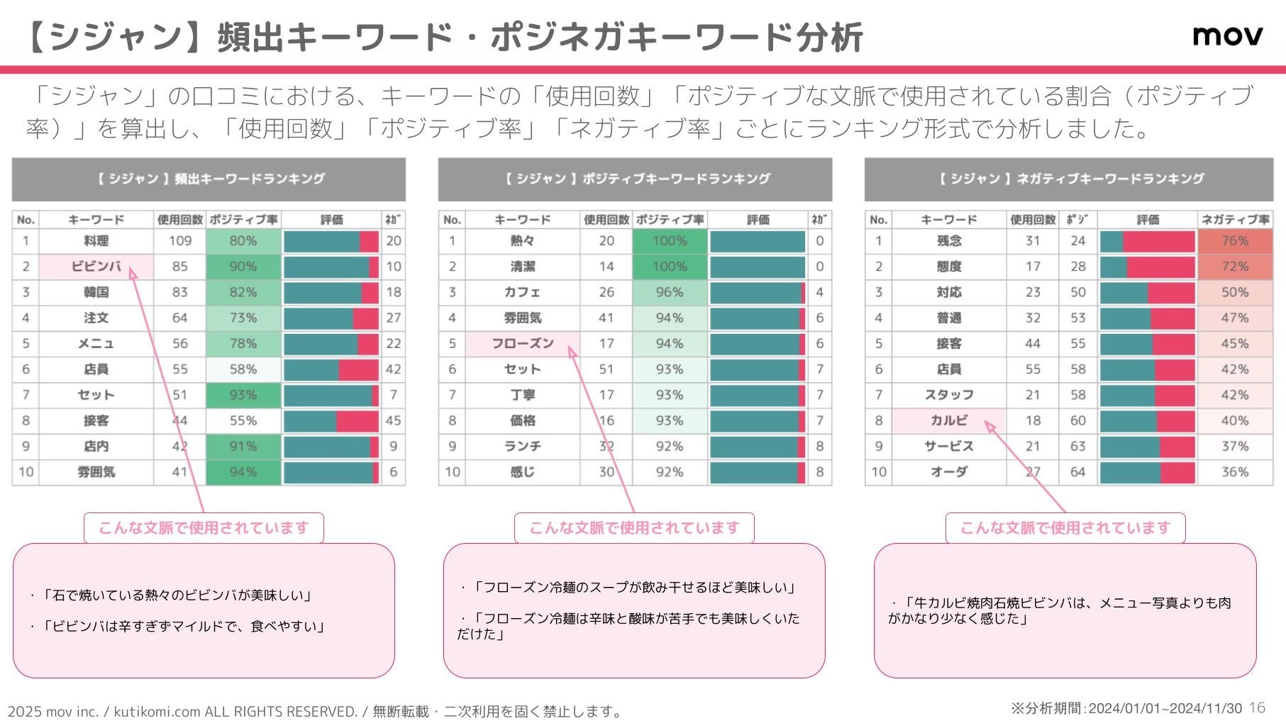 こちらの表では、「シジャン」の口コミにおけるキーワードの「使用回数」「ポジティブな文脈で使用されている割合(ポジティブ率)」を算出し、「使用回数」「ポジティブ率」「ネガティブ率」ごとにランキング形式で分析しています。