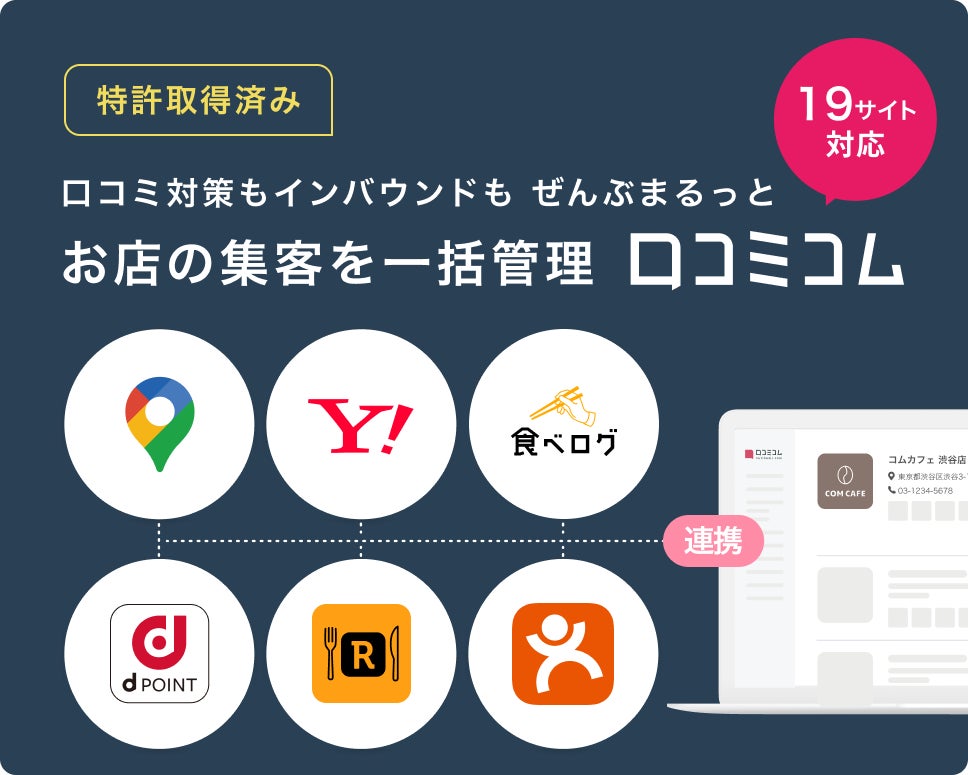 口コミコムは、国内外の口コミサイトを”もっと”売上に変える「口コミサイトの一括管理ツール」です。口コミの情報を活かした店舗改善やGoogleマップ・口コミサイトからの集客数増加を支援します。