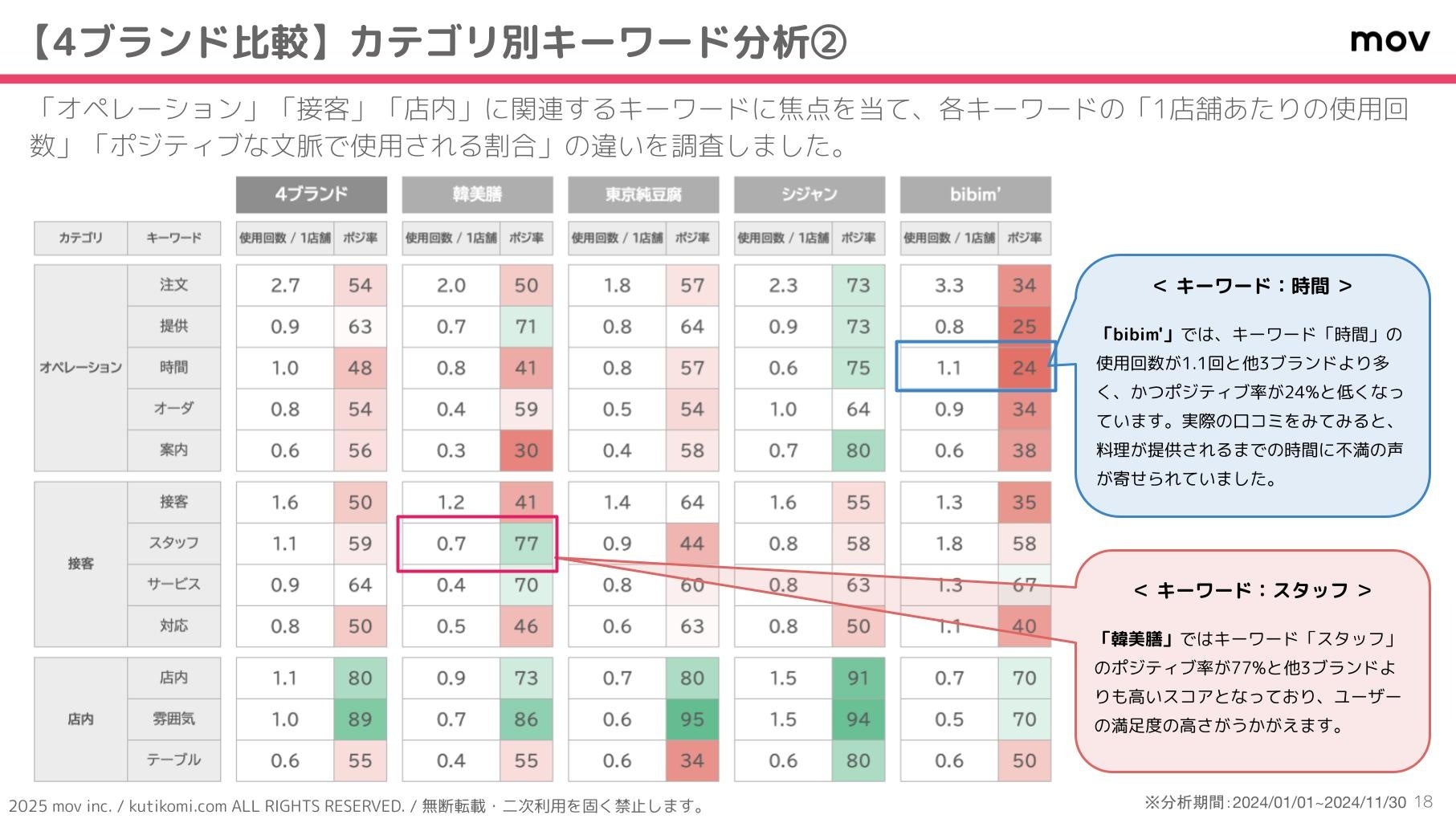 「韓美膳」ではキーワード「スタッフ」のポジティブ率が77%と他3ブランドよりも高いスコアとなっており、ユーザーの満足度の高さがうかがえます。