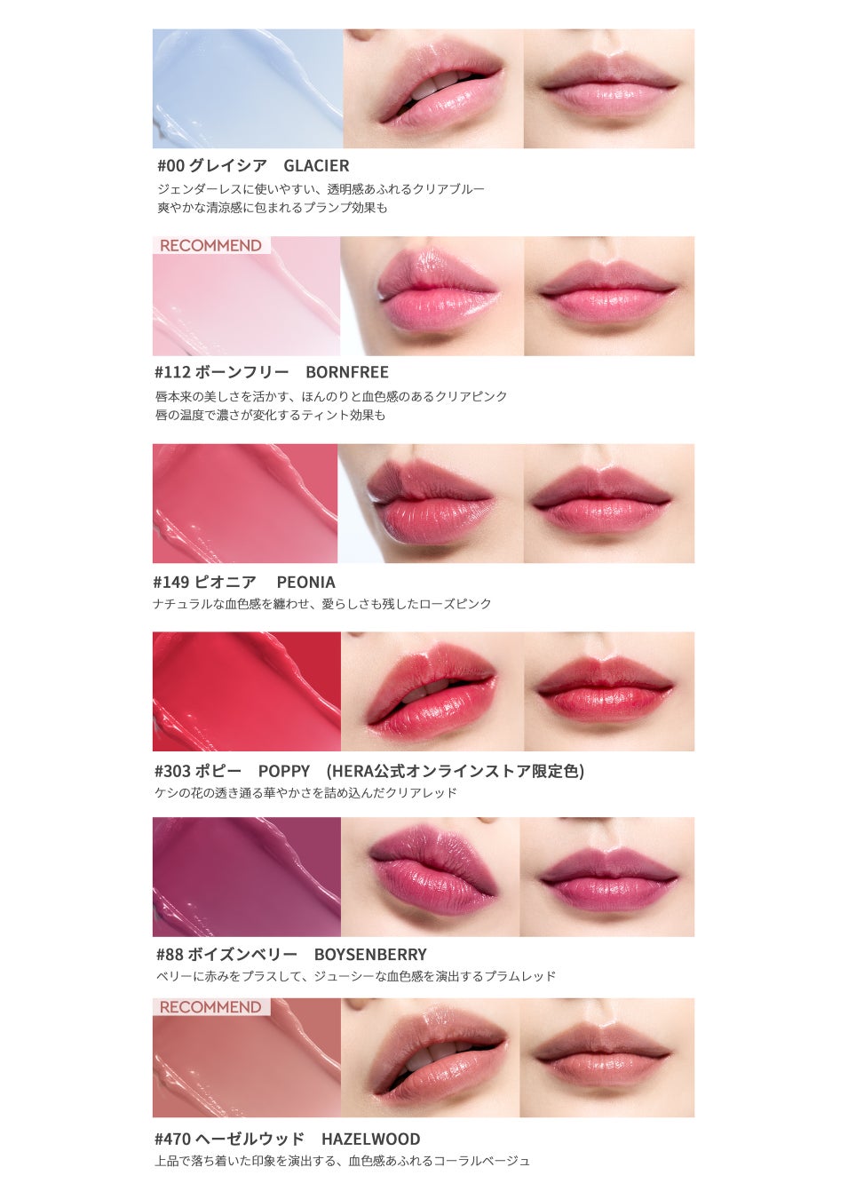 ジェンダーレスに使いやすい、透明感あふれるクリアブルー「#00 グレイシア」やほんのりと血色感のあるクリアピンク「#112 ボーンフリー」のクリアなカラーから、上品で落ち着いた印象のコーラルベージュ「#470 ヘーゼルウッド」をはじめ、ローズピンク、クリアレッドやプラムレッドなどの唇本来の美しさを活かす、透明感あふれるカラーバリエーションが揃います。