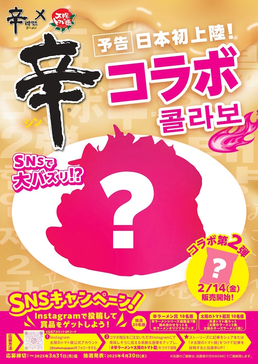 「辛ラーメン×トマト麺」コラボを記念してSNSキャンペーンを開催いたします。応募方法は、Instagramの太陽のトマト麺公式アカウントをフォローして、“#辛ラーメン✕太陽のトマト麺”とともに「辛ラーメン×トマト麺」コラボメニューの写真を投稿。辛ラーメンシリーズ袋麺全7種&オリジナルグッズが詰まった「辛ラーメン賞」と、冷凍の太陽ラーメンとチーズラーメン各2食をセットにした「太陽のトマト麺賞」が、それぞれ抽選で10名に当たるスペシャルなキャンペーンです。