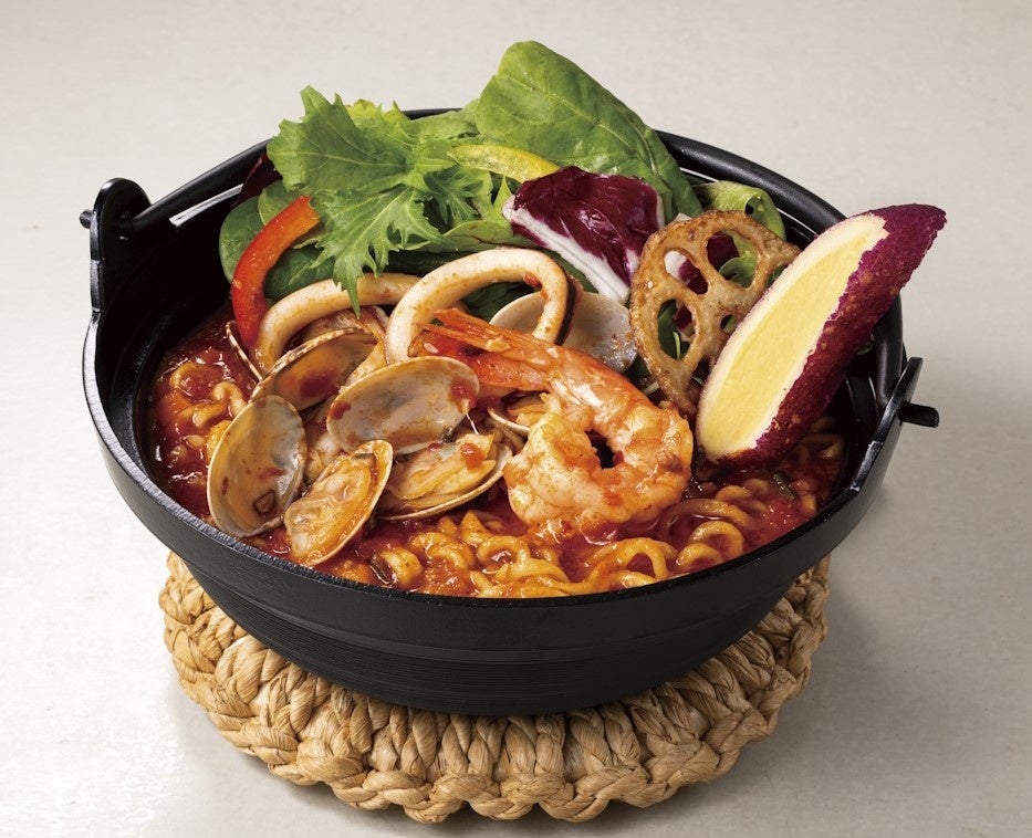 辛ラーメンをベースに、自家製トマトソース、鶏白湯スープを合わせることで辛ラーメン独自の辛味と、トマトの酸味、甘味がスープの旨味とコクを引き出し、さらに尾付き海老、アサリ、イカの海鮮の旨味が重なることでコク深い味わいの辛トマトスープに仕上げました。トッピングの野菜は、鮮やかなベビーリーフとパプリカ、揚げレンコン。コグマパン(さつまいもを使用した韓国で話題のパン)をトッピングし韓国感を演出した今だけの限定コラボメニューです。