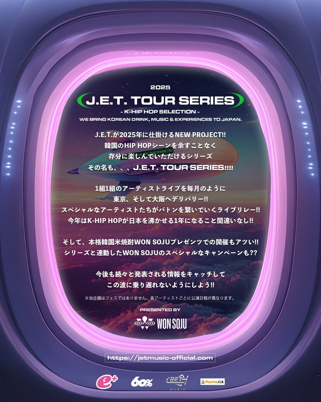 韓国エンタメコンテンツ、特にK-POPやK-HIP HOPのアーティストを軸としたライブやツアー、フェスなどの興行を多数行なってきたJ.E.T.が2025年最初に打ち出す新たな企画がこの「J.E.T. TOUR SERIES presented by WON SOJU」。