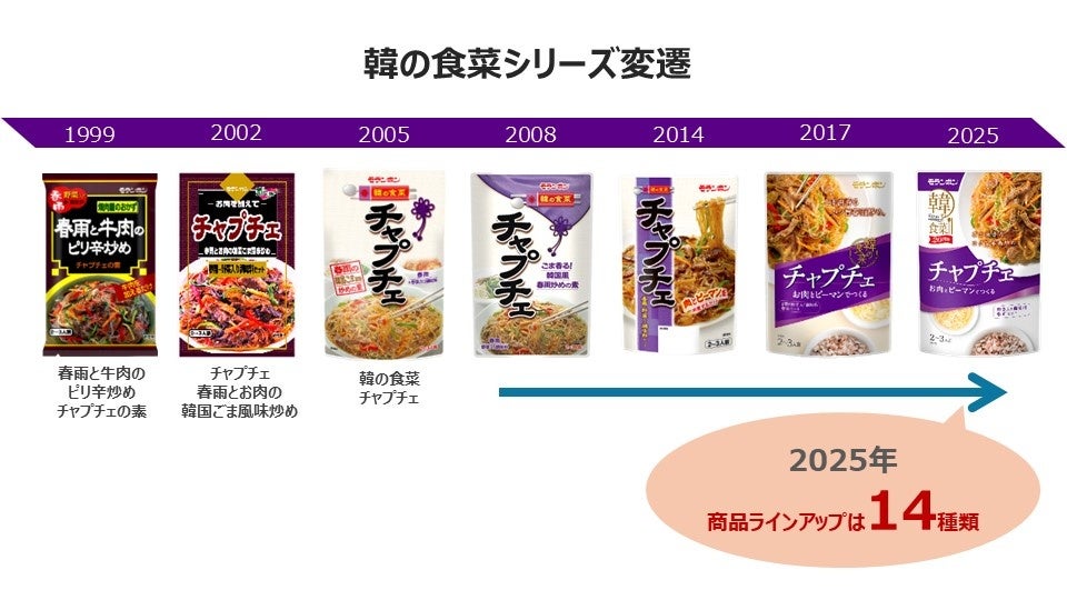 1999年に「韓の食菜 チャプチェ」の前身商品として、「春雨と牛肉のピリ辛炒め チャプチェの素」を発売しました。その後、弊社の韓国関連商品を「元気!!コリアごはん」としてシリーズ化し、「焼ビビンバ」や「豚キムチ」などの商品を展開しました。2000年初頭から韓流ブームが高まる中で、「韓の食菜」シリーズとしてラインアップを整え、「韓の食菜 チャプチェ」のTVCM放送を実施しました。これにより、「チャプチェ」というメニューの認知度が広がりました。現在では、「チャプチェ」や「プルコギ」を中心に、14種類の韓国関連商品を「韓の食菜」シリーズとして展開しています。