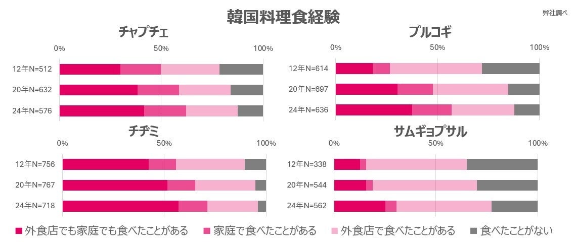 韓流ブームは2000年初頭に始まり、現在は第四次まで続いています。このブームの中で、音楽やコスメと並んで韓国料理も注目を集めており、居酒屋やファミリーレストラン、コンビニエンスストア、スーパーマーケットなどで開催される韓国フェアを通じて、生活者の韓国料理を選ぶ機会が増えています。弊社の調べによると食経験としては年々伸長しており、外食店やご家庭でも召しあがられていることから、日本の食に韓国料理が浸透してきているといえます。