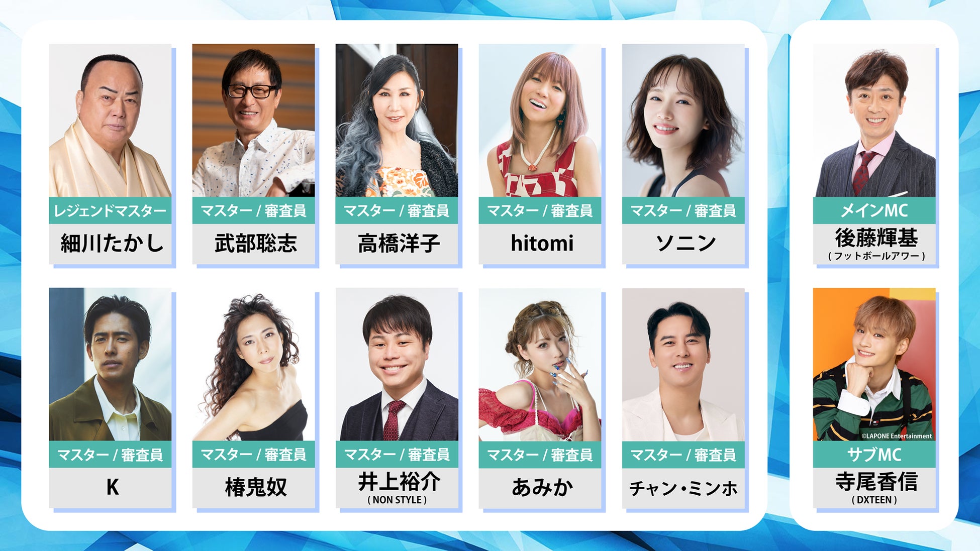 既報の細川たかし、武部聡志に加え、高橋洋子、hitomi、ソニン、K、椿鬼奴、井上裕介(NON STYLE)、あみか、チャン・ミンホといった錚々たる顔ぶれがマスター/審査員として勢ぞろいします。