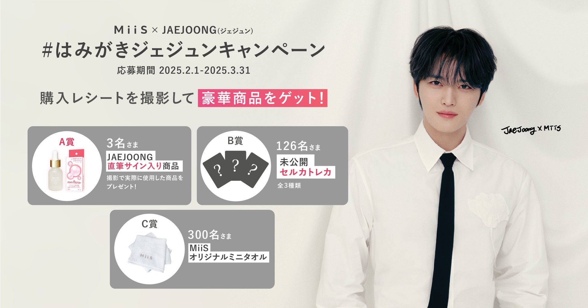 株式会社ライスカレーの連結子会社で、ウェルネスに関連したブランド、サービスの開発・提供を軸にコミュニティブランド、メディア、マーケティングソリューションを提供する株式会社WinCが展開するオーラル美容ブランド「MiiS(ミーズ)」は、JAEJOONG(ジェジュン)さんのアンバサダー就任を記念し、購入レシートで応募できるプレゼントキャンペーンと、2月12日(水)より順次、一部店舗にて数量限定のノベルティ配布キャンペーンを開催いたします。
