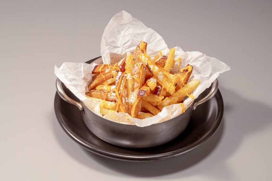 フライされたホクホクのさつまいもとしょっぱいポテトの上に、粉糖とメイプルシロップをかけて甘じょっぱく仕上げました。