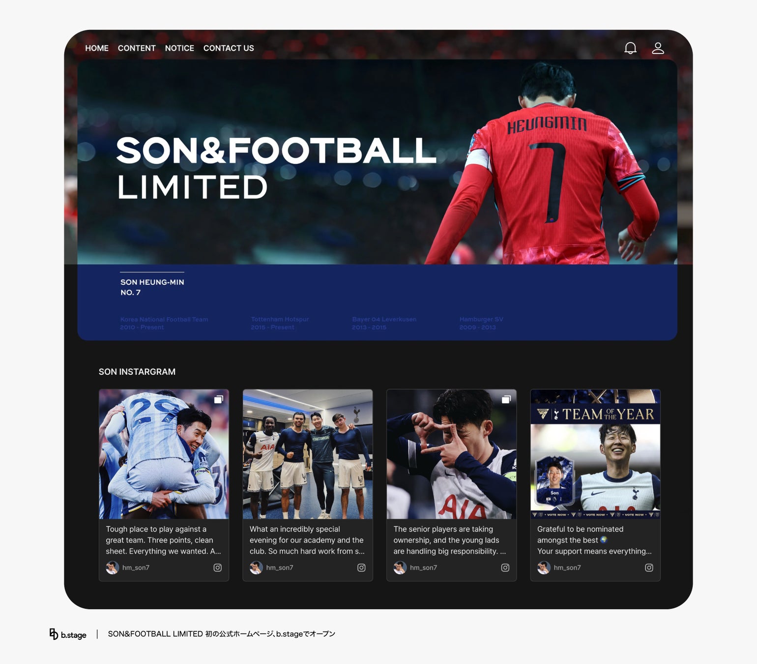 SON&FOOTBALL LIMITED b.stageは、▲HOME(ホーム)▲CONTENT(コンテンツ)▲NOTICE(お知らせ)などのカテゴリーで構成されており、選手と所属事務所に関するお知らせを簡単に確認することができる。 この他にも今後、b.stageの多様な機能を活用した双方向コミュニケーションも計画している。