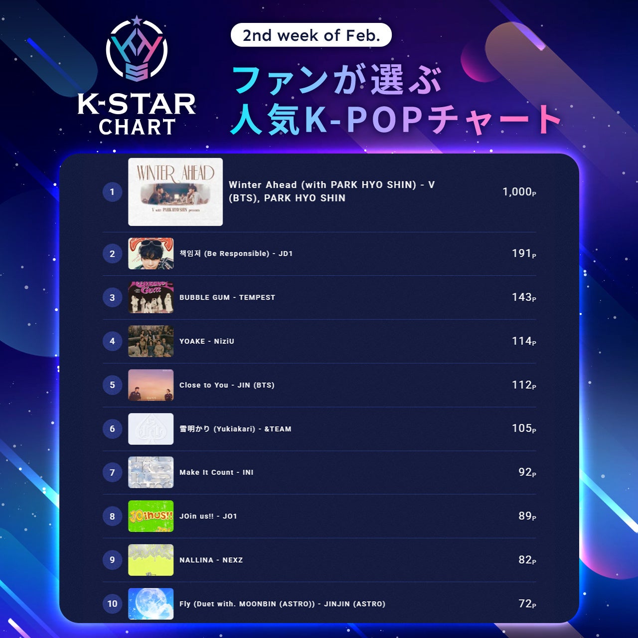 『K-STAR CHART presents POP-K TOP10 Friday』2月14日(金)の放送回において、Vの「Winter Ahead (with PARK HYO SHIN)」が、チャート投票で6回目の1位を獲得し、今週のNo.1曲として番組内で放送されました。