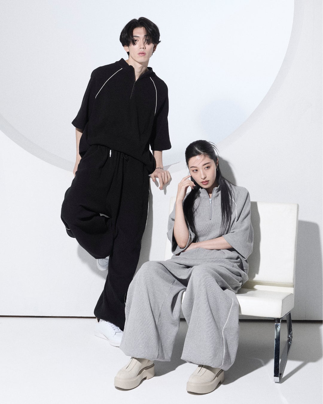 都会的なエッジを効かせたハーフジップトップスと、美しく計算されたシルエットのボトムス。