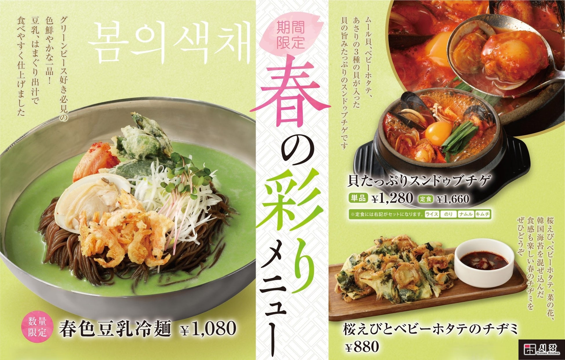株式会社グルメ杵屋グループの株式会社グルメ杵屋レストランが 運営する「Korean Kitchen Shijan(シジャン)」では、季節ごとに旬の食材の韓国料理を楽しんでいただけるメニューをご用意しております。この春は2025年3月18日(火)~2025年5月31日(土)の期間、見た目鮮やかな春色の冷麺、貝の旨みたっぷりのチゲなど 「春の彩りメニュー」 3品を店舗限定でご提供いたします。