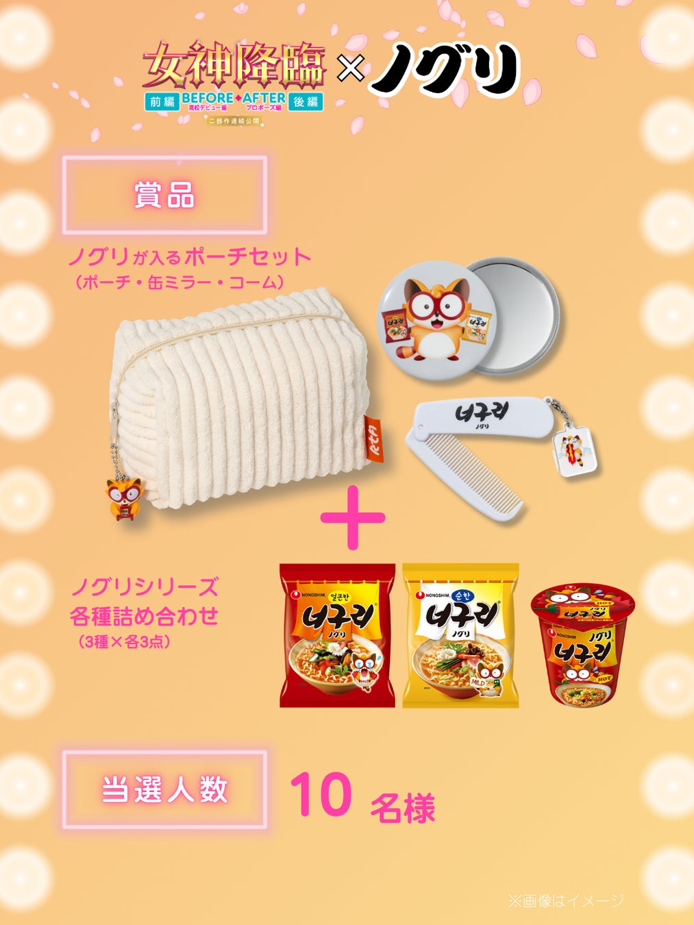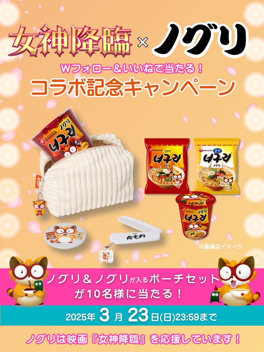 映画『女神降臨』と「ノグリ」のコラボを記念して、SNSキャンペーンを開催。女神降臨・辛ラーメン公式Instagram・XをWフォローの上、キャンペーン投稿をいいね・リポストしてくれた方の中から、抽選で合計20名様にノグリグッズやノグリシリーズ製品詰め合わせが当たります。