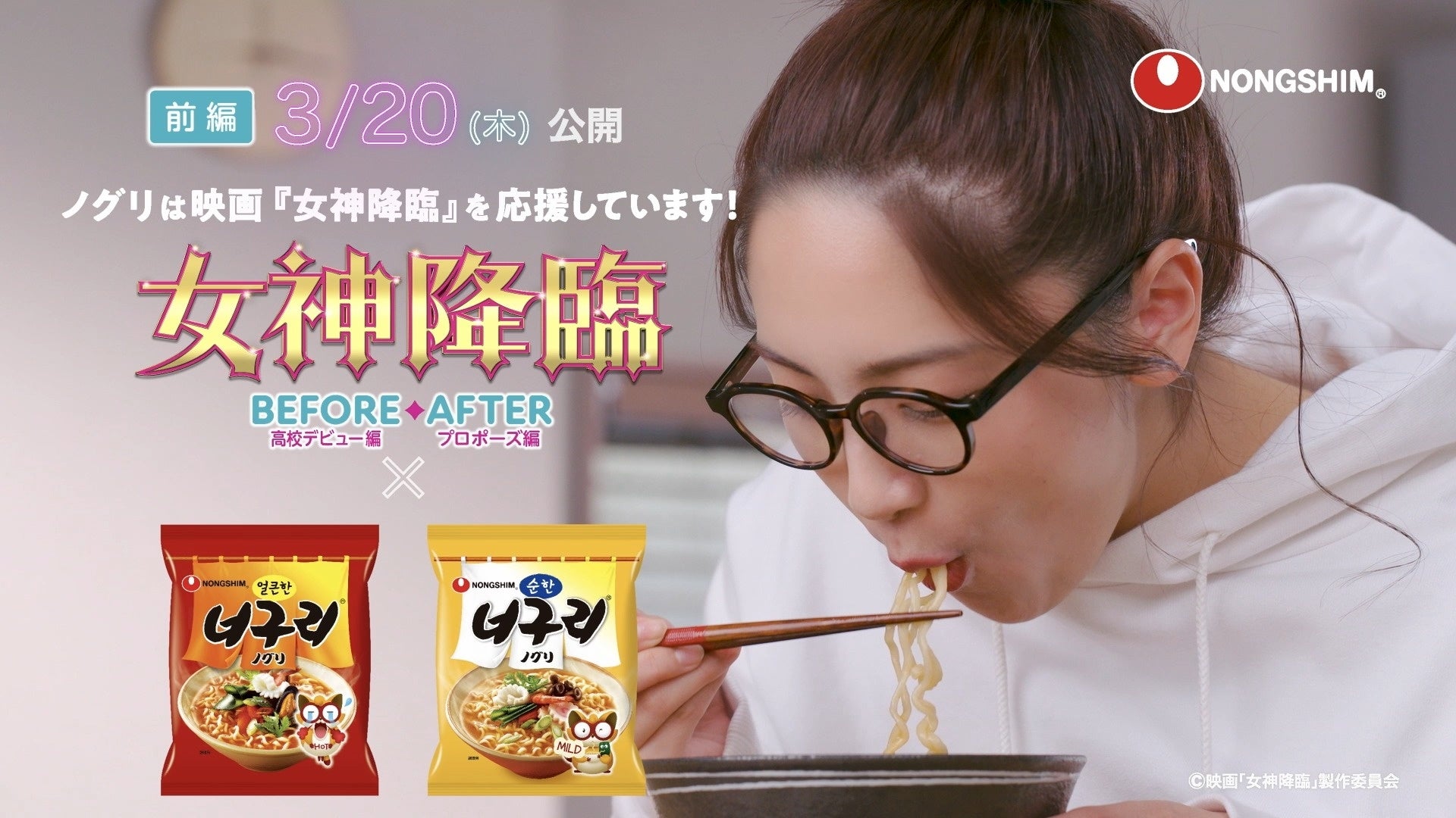 株式会社農心ジャパンは、辛ラーメンよりも歴史があり、韓国ではトップブランドのインスタントラーメン「ノグリ」と映画『女神降臨』(※)との初コラボCM(15秒)を3月14日(金)から配信します。映画では、イケメン男性2人の間で揺れ動く女性を中心とする話ですが、CMに出演する女性は、製品の特徴である、もちもち麺(イケている麺)の2つのラーメンの間で揺れ動く女性の表情に注目です。