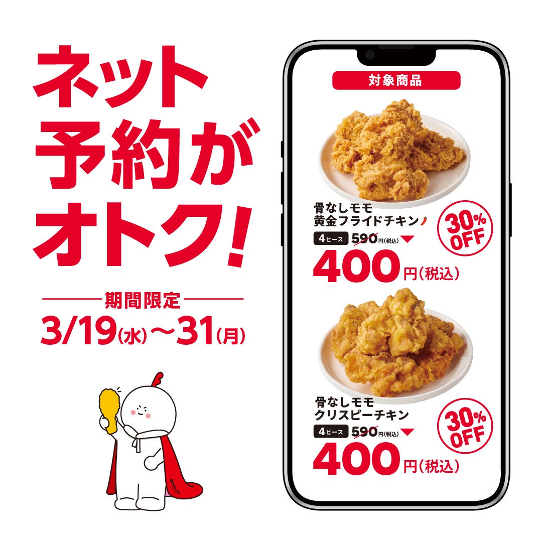 この期間ネット予約のお客様限定で、対象商品である骨なしモモ黄金フライドチキン、骨なしモモクリスピーチキンがそれぞれ590円⇒400円(税込)と、30%以上お安く買えるとってもトクなキャンペーンです。