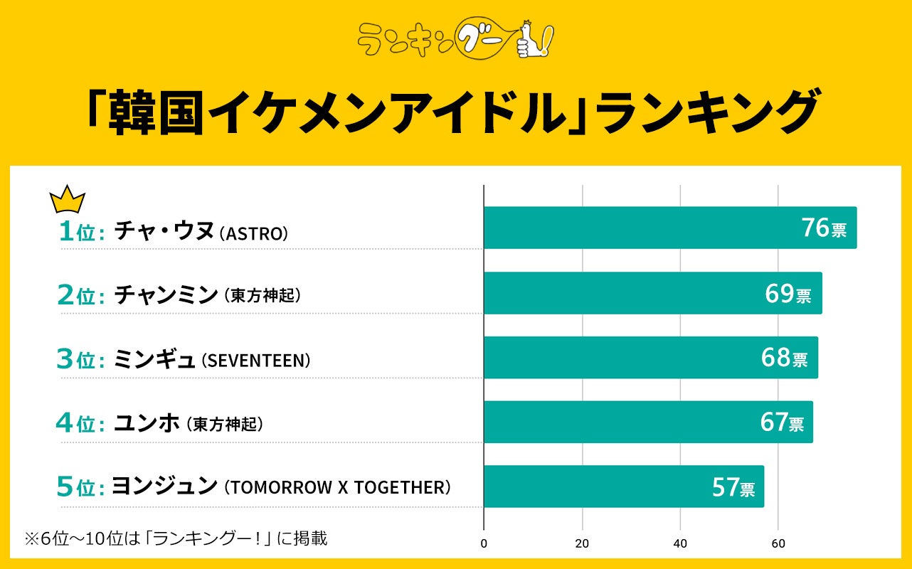 順位は僅差で決定しました。1位は“顔天才”や“顔面国宝”といった異名まで持つ人気アイドルのチャ・ウヌ(ASTRO)に決定!2位は日本でも絶大な知名度を誇る、チャンミン(東方神起)。3位はグループ内で最も高い身長187cmという体格の良さが魅力の、ミンギュ(SEVENTEEN)。4位はユンホ(東方神起)。そして、5位はヨンジュン(TOMORROW X TOGETHER)がランクインしました!