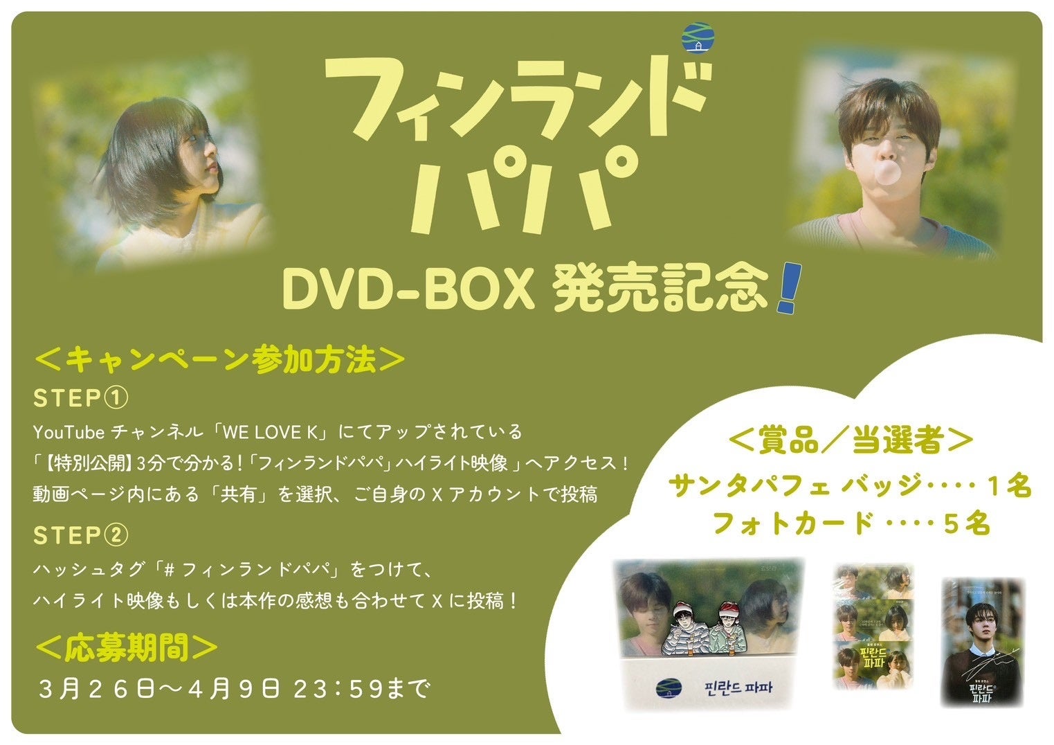 YouTubeチャンネル「WE LOVE K」にてアップされている「【特別公開】3分で分かる!「フィンランドパパ」ハイライト映像」へアクセスし動画ページ内にある「共有」を選択、ご自身のXアカウント で投稿。(ハイライト映像:https://youtu.be/1pPXeBtso9A)