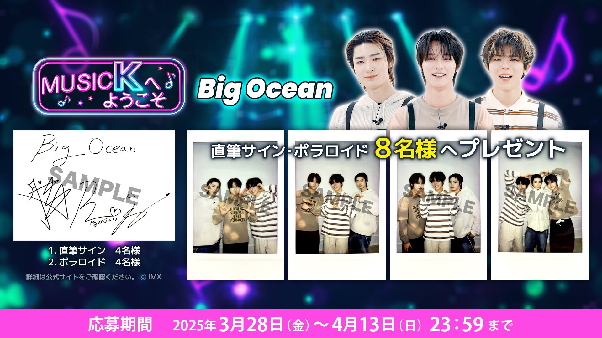 「Music Kへようこそ!」最新話更新を記念して、Big Oceanの直筆サインとポラロイドが抽選で8名様に当たる豪華プレゼント企画を本日18時より実施。Music Kの公式X、および公式サイトをご確認のうえ詳細をお待ちください。