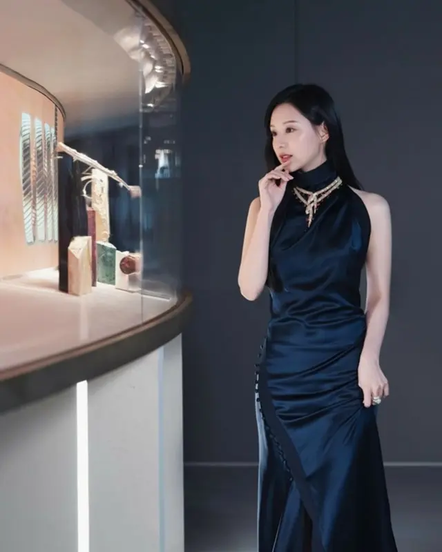 キム・ジウォンはホルターネックデザインのブラック、ネイビーのシルクドレスを着て展示会を見ている。
