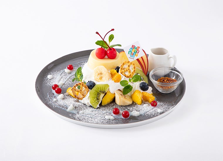 パンケーキにホイップ、フルーツ、プリンをトッピングしたプレート