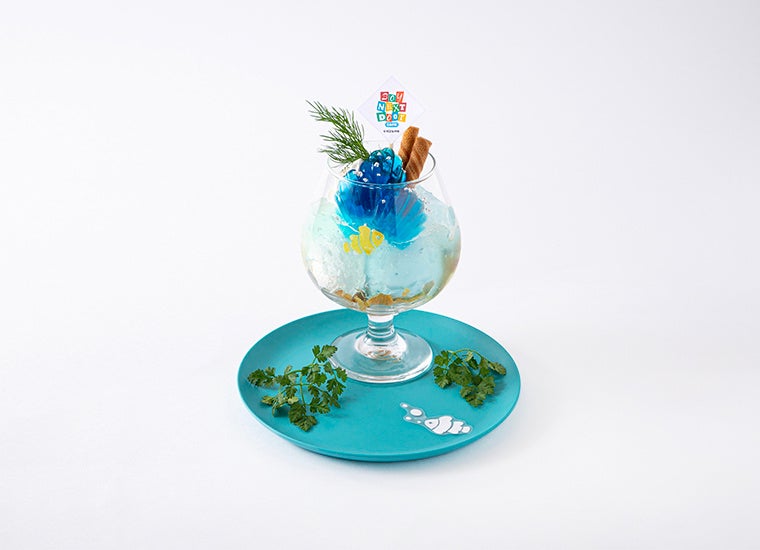 貝殻形のグミを乗せたラムネシャーベットとヨーグルトアイスのグミサンデー