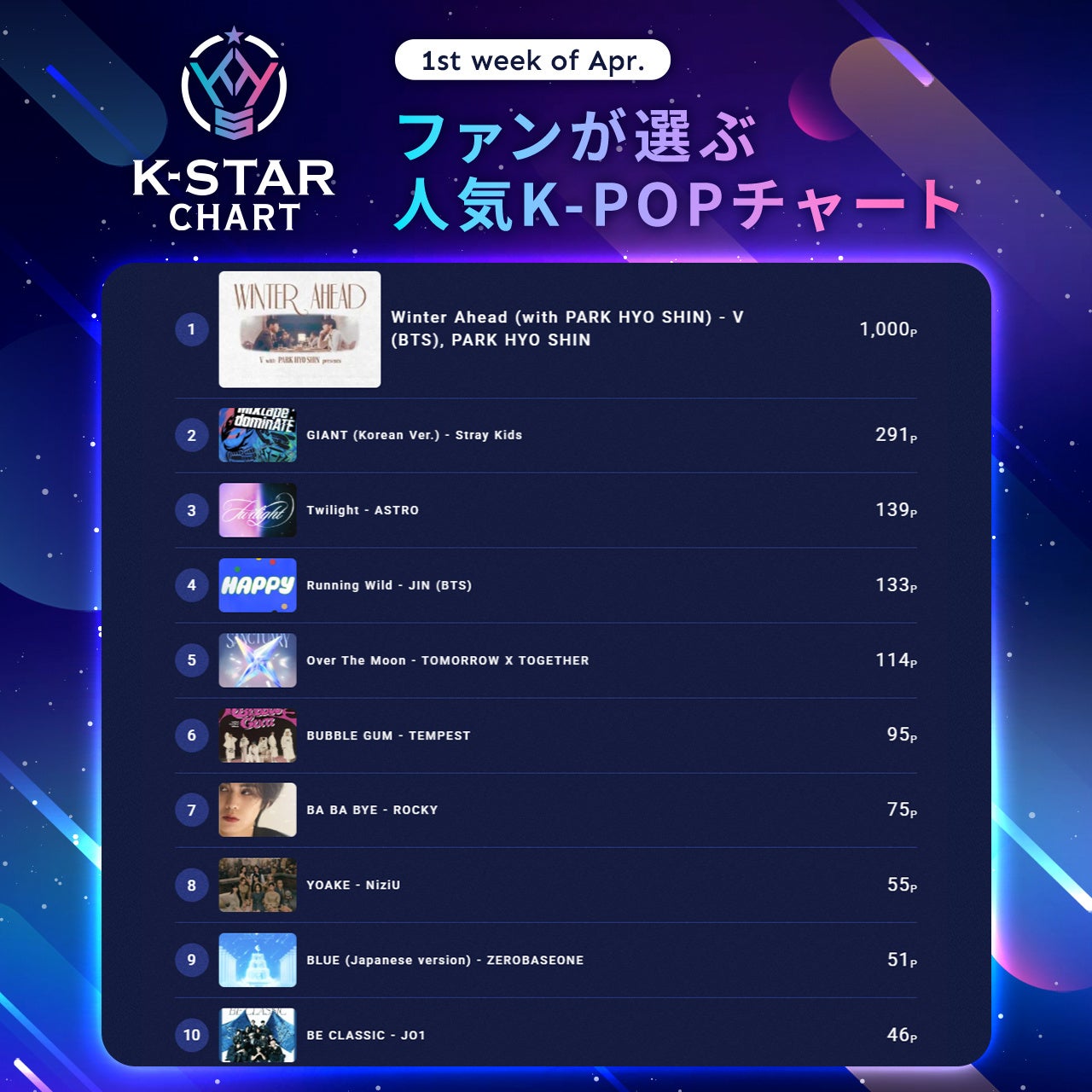 『K-STAR CHART presents POP-K TOP10 Friday』4月4日(金)の放送回において、10位にJO1の「BE CLASSIC」、9位にZEROBASEONEの「BLUE (Japanese ver.)」、7位にROCKYの「BA BA BYE」、2位にStray Kidsの「GIANT (Korean Ver.)」が初登場ランクインし番組内で放送されました。