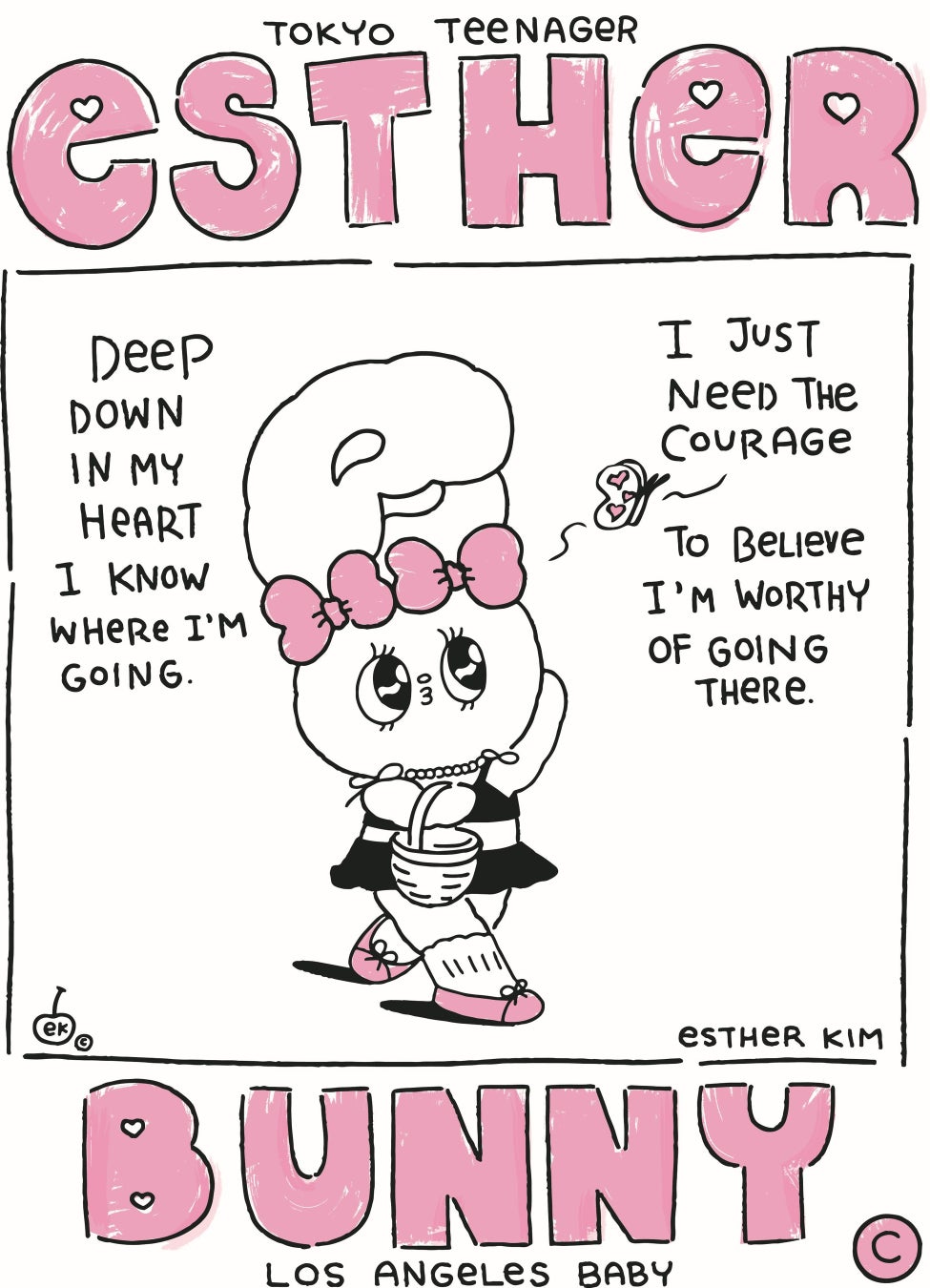 韓国系アメリカ人のエスター・キム(Esther Kim)は、米国、韓国、日本を行き来しながら、ファッションデザインやイラストレーション制作、アートディレクションなど多彩な創作活動を行っている。ロサンゼルスで生まれ、10代を東京で過ごした彼女は、異なる文化の中で多様な感性を育んだ。この経験は彼女の芸術的インスピレーションに大きな影響を与え、やがてエスターバニーの誕生へとつながった。 エスターバニーの可愛らしい姿の裏には、内面の悲しみや、それを乗り越え、自分自身を愛そうとするメッセージ「LOVE MYSELF」が込められている。