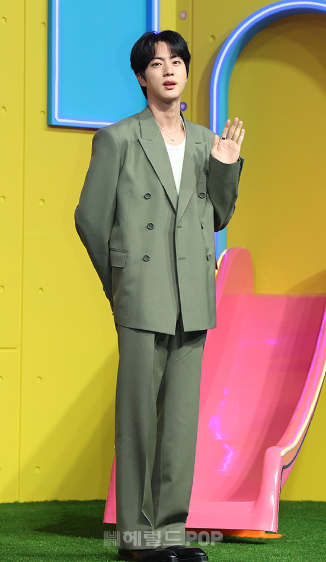 キアン84、「BTS(防弾少年団)」のJIN、チ・イェウン、チョン・ヒョミンプロデューサー、イ・ソミンプロデューサー、ファン・ユンソプロデューサーが15日午前、ソウル・チュン(中)区トンデムン(東大門)のJWマリオットホテルで行われたNetflixバラエティー「キアンの破天荒ゲストハウス」の記者会見に出席し、フォトタイム撮影に臨んだ。