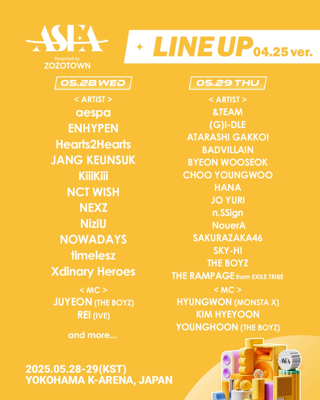 音楽とスター、そしてファンが一体となる、「ASIA STAR ENTERTAINER AWARDS 2025 in JAPAN Presented by ZOZOTOWN」(略称 ASEA 2025 Presented by ZOZOTOWN)が5月28日、29日に日本の横浜市にあるKアリーナ横浜で開催され、チョ・ユリ、NOWADAYS、NouerAの出演が決定したと、4月22日にASEA組織委員会が公式発表した。