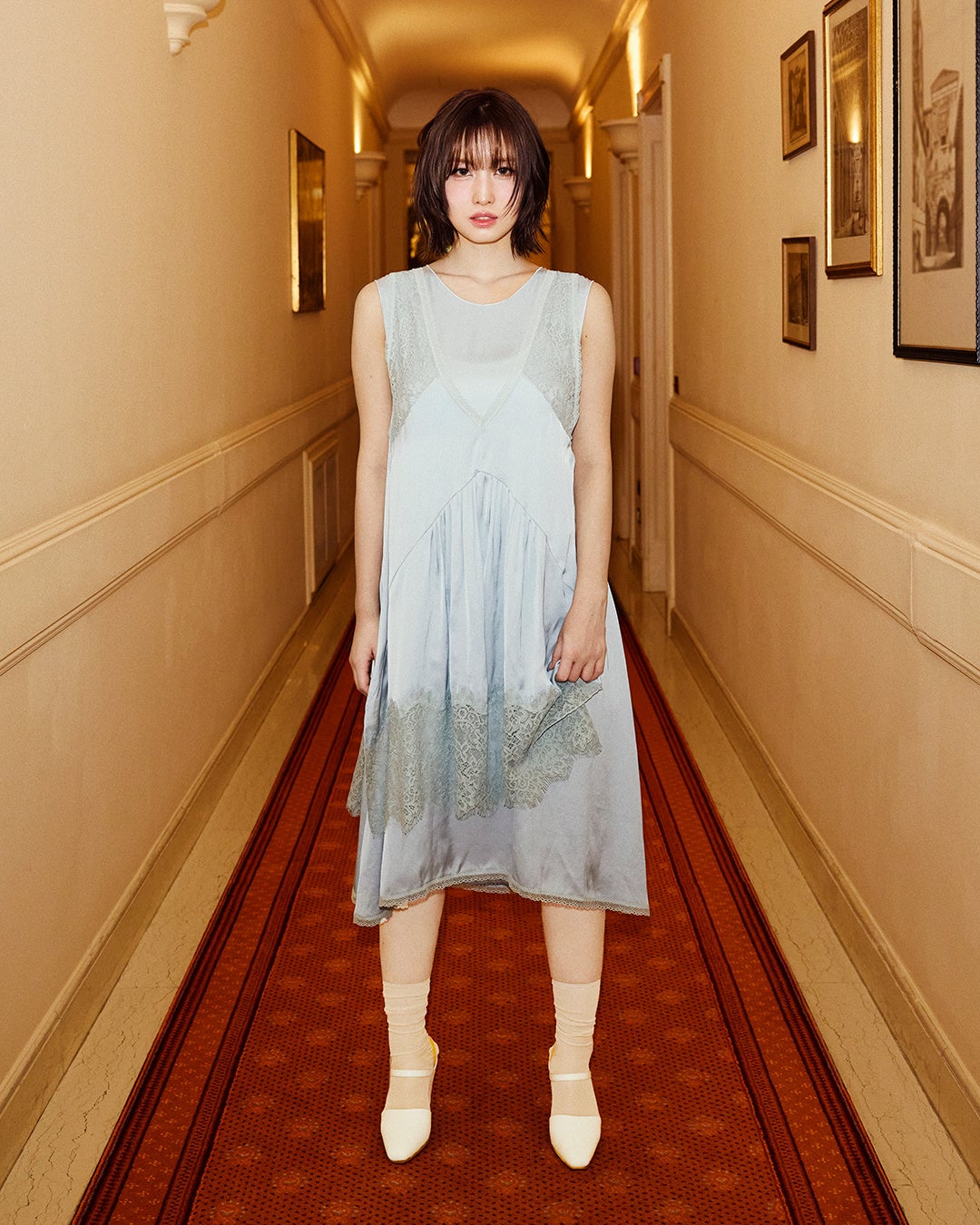 MOMO氏が着用するドレスは、ランジェリーウエアやニットなどの日常的なアイテムを引き算の美学によって再解釈し、ディテールの繊細さを引き出しています。シンセティックファーがあしらわれたクロッグやパンプス、サマーサンダルなどのフットウエアと合わせ、ドレッシーでありながらも、リラックスできるコンフォートさを表現したユニークなスタイリングとなっています。フォーマルから日常的なシーンまでさまざまな場面での着用が可能です。