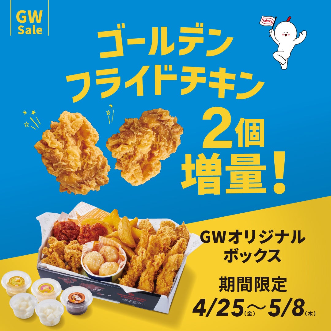 ゴールデンウィークは、大切な人たちと一緒に本物の韓国フライドチキンを楽しむ絶好のチャンス!「GWオリジナルボックス」は、韓国№1チキンブランド「bb.q」のオリジナルレシピで作った骨なし黄金フライドチキンやヤンニョムチキン、チーズボール、フライドポテトなど、みんなが喜ぶメニューが一度に楽しめる豪華なセット。4月25日~5月8日までの期間限定で、積み上げ価格よりも720円もお得に。この機会に、友達や家族、大切な人と一緒にワイワイ楽しんでください!