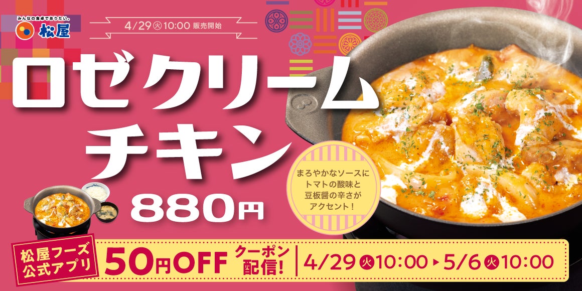 このたび松屋フーズでは、牛めし・カレー・定食・その他丼の「松屋」におきまして、2025年4月29日(火)10時より「ロゼクリームチキン」を販売いたします。