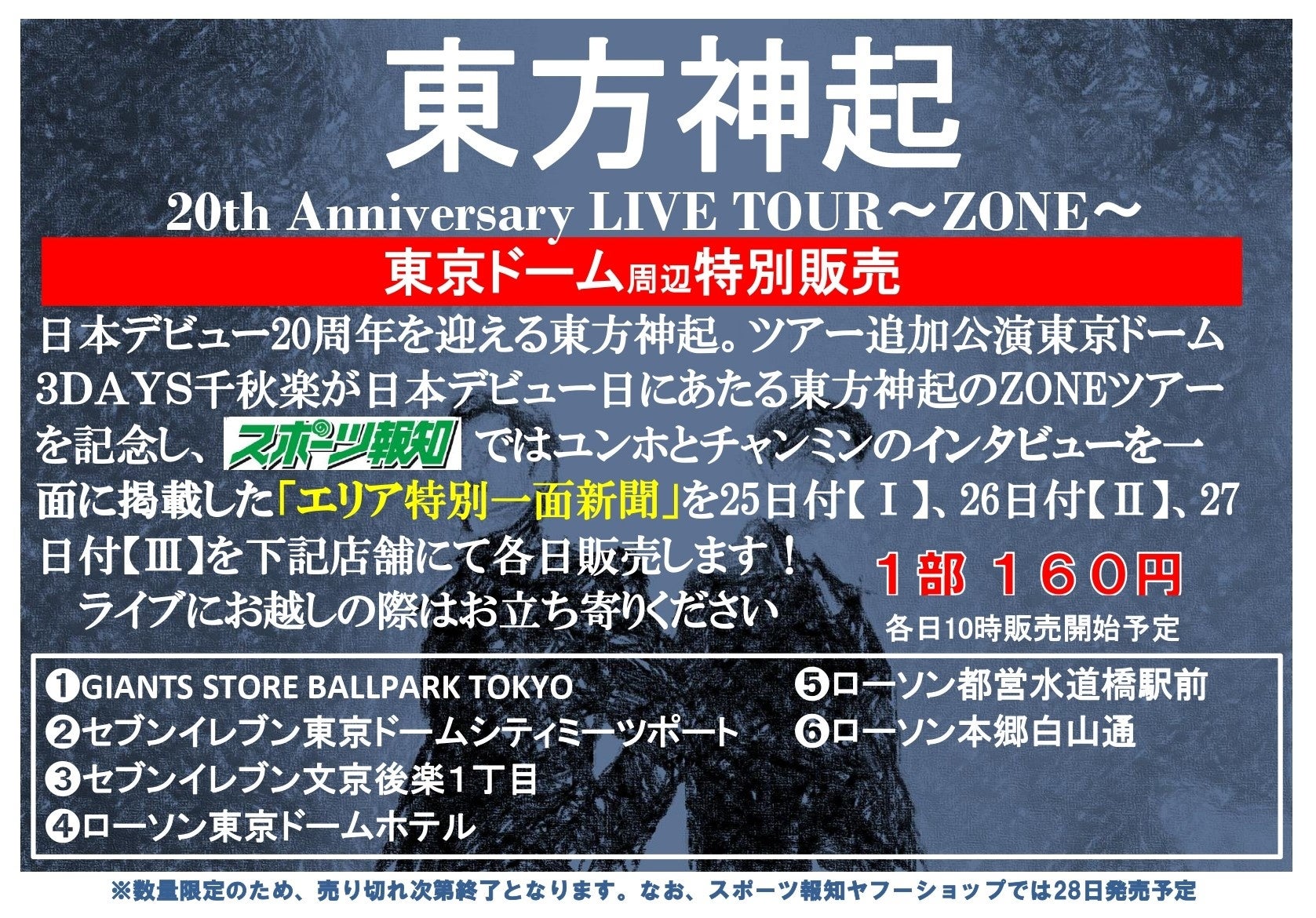 スポーツ報知を発行する報知新聞社は4月25、26、27日に東京ドームで開催される東方神起の東京公演を記念して、3日連続で特別1面新聞を東京ドーム周辺で販売します。ユンホ&チャンミンのインタビューを一面に掲載した特別版。25日付【Ⅰ】、26日付【Ⅱ】、27日付【Ⅲ】を3日間下記の店舗で販売します。ぜひお立ち寄りください。