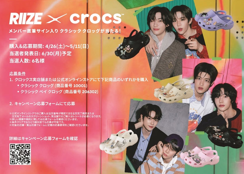 レディース、メンズ、キッズの革新的なカジュアルフットウェアのグローバルリーダーであるクロックス™は、ジャパンアンバサダー「RIIZE」の直筆サイン入りクロッグが抽選で当たる2大プレゼントキャンペーンを2025年4月26日(土)より開始することをお知らせいたします。