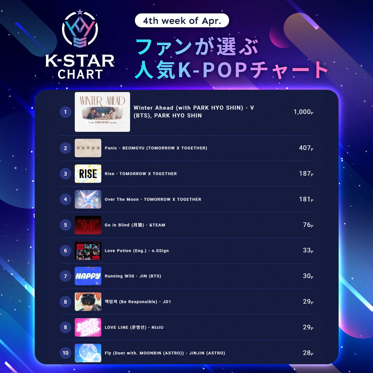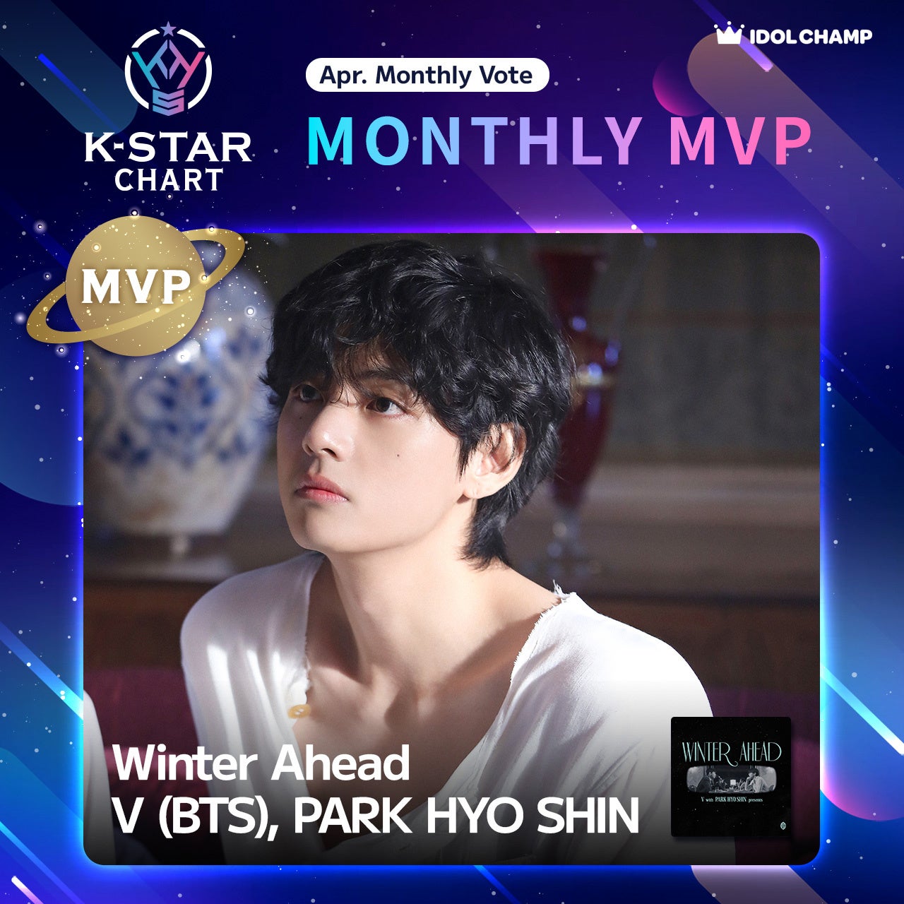 『K-STAR CHART presents POP-K TOP10 Friday』週間チャートの投票数をベースに算出された4月の累計ポイント数で決まる月間チャート1位はV (BTS), PARK HYO SHINの「Winter Ahead (with PARK HYO SHIN)」となり4月のMVPとして番組内で放送されました。