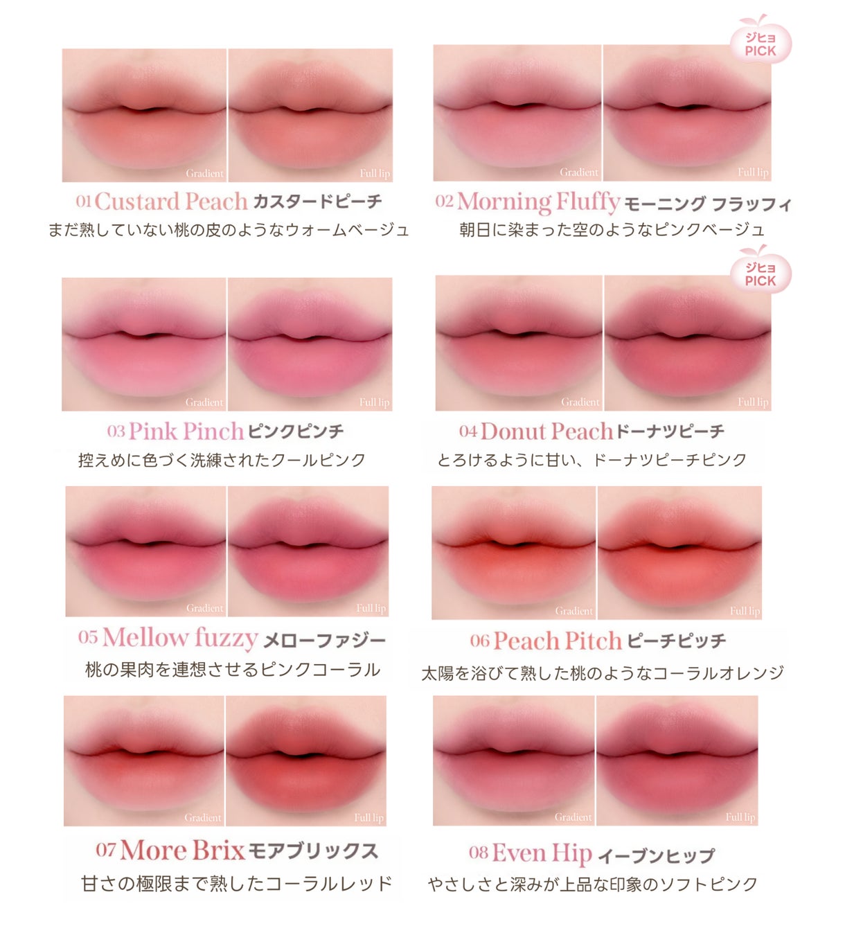 ヨーロッパで愛される平らな形の桃“ドーナツピーチ”からインスピレーションを受けて作られた8カラー。自然にぼかしたようなマットな色味で、色落ちしにくく、長時間塗りたての美しさが続きます。(*3)
