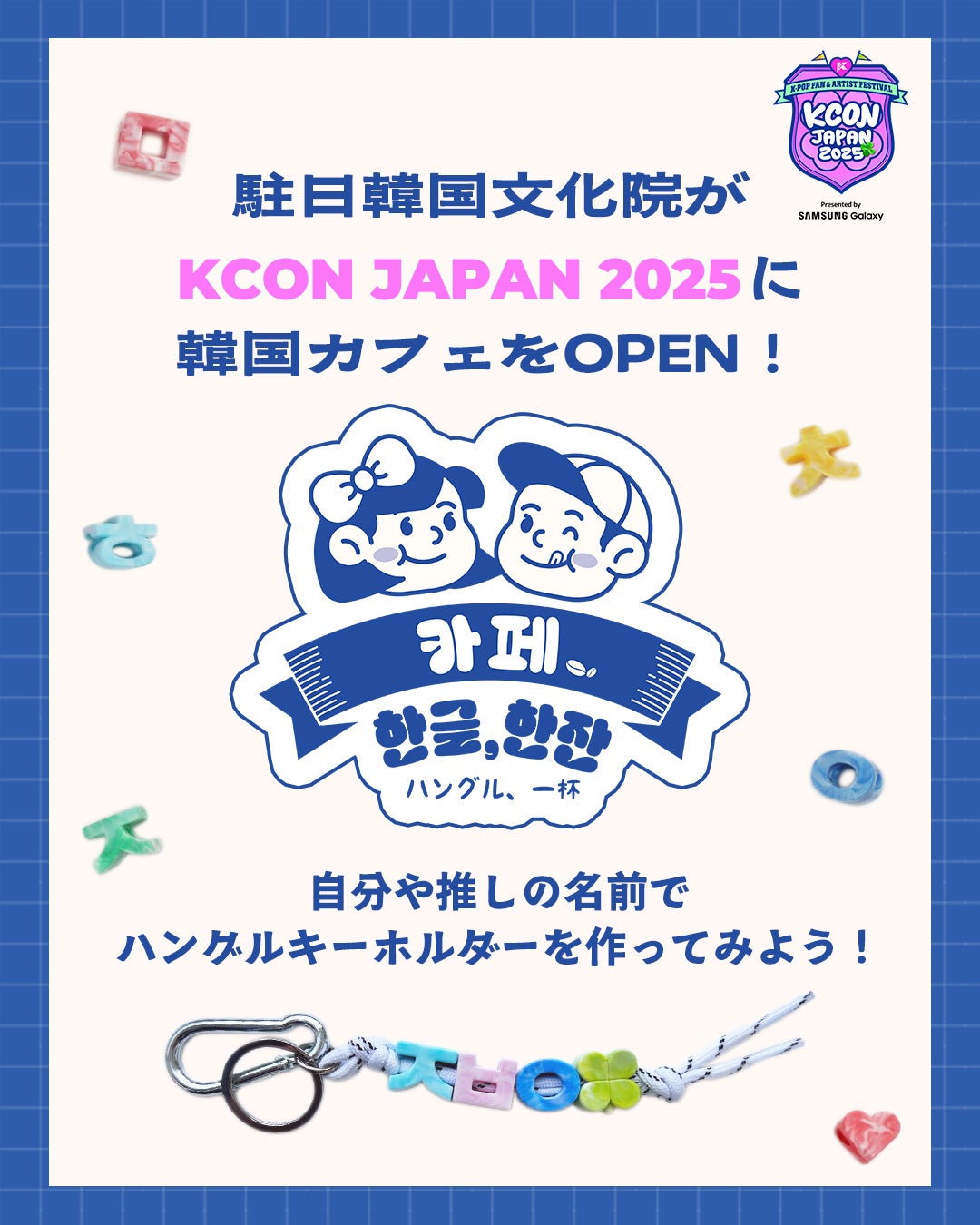 駐日韓国文化院は、韓日国交正常化60周年を記念し、これからの韓日関係を担う10-20代の人的・文化的交流を図るため、K-POP Fan & Artist Festival「KCON JAPAN 2025」に韓国の文字「ハングル」をテーマにしたブースを出展します。日本でも人気の高い韓国のカフェ空間を再現し、韓国人スタッフへの韓国語での注文体験やハングルの子音を組み合わせたオリジナルキーホルダー作りなど、ハングルを五感で楽しむことができるイベントを実施します。
