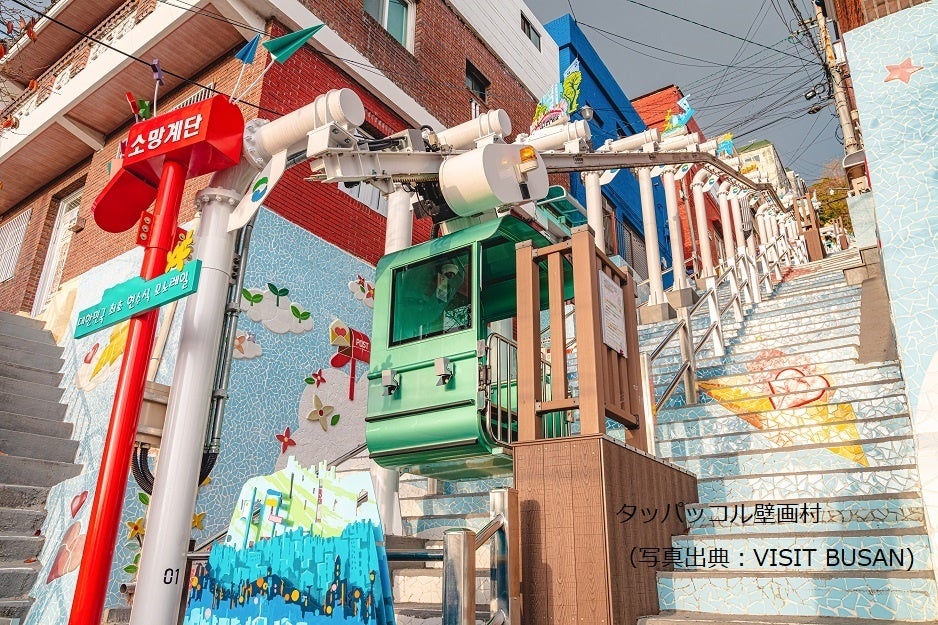 らくらくモノレールで坂を上がっていくアートなスポットができました。モノレールをバックに釜山の街を写すフォトスポットをお楽しみください!(モノレールは基本的には住民優先!)