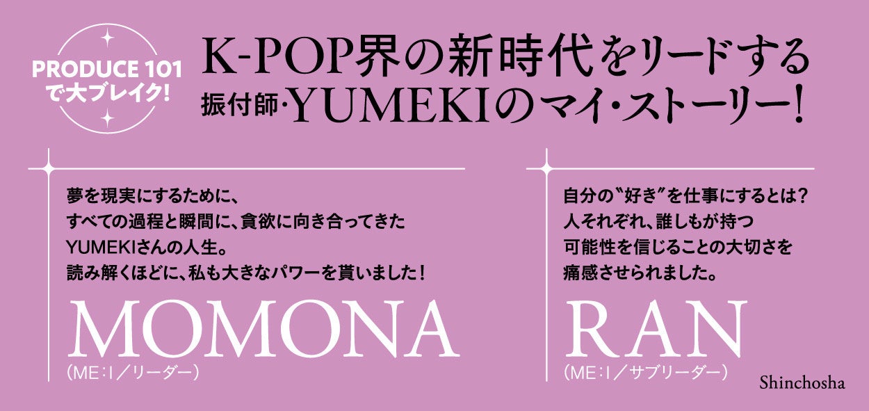 株式会社Nateeは運営するクリエイター事務所のWOWsに所属するYUMEKIがK-POP界の新時代をリードする振付師になるまでを書き下ろした『ONE DANCE 世界で夢を叶える生き方』を5月29日、新潮社より刊行することをお知らせします。刊行に先立ち、「日プ女子」の秘話が語られる第1章までを無料で公開いたします。