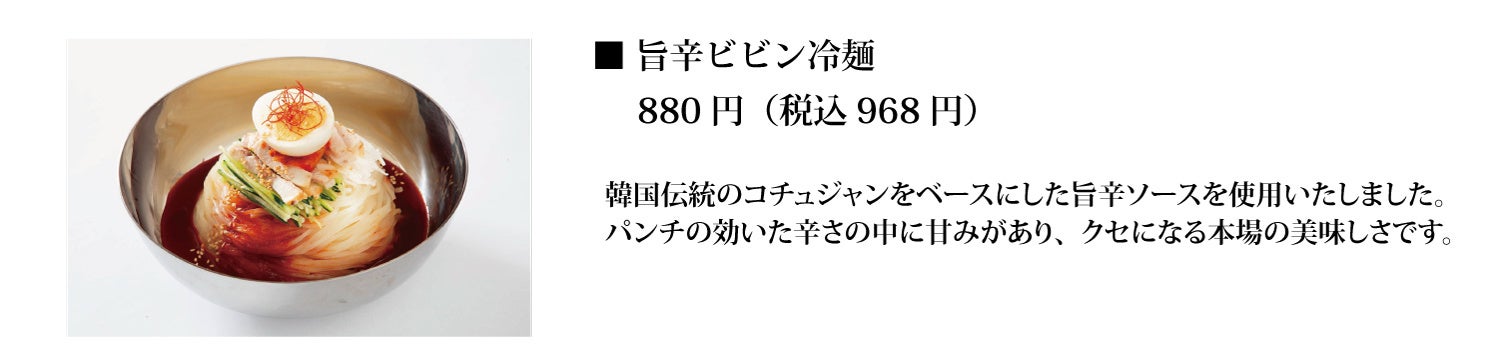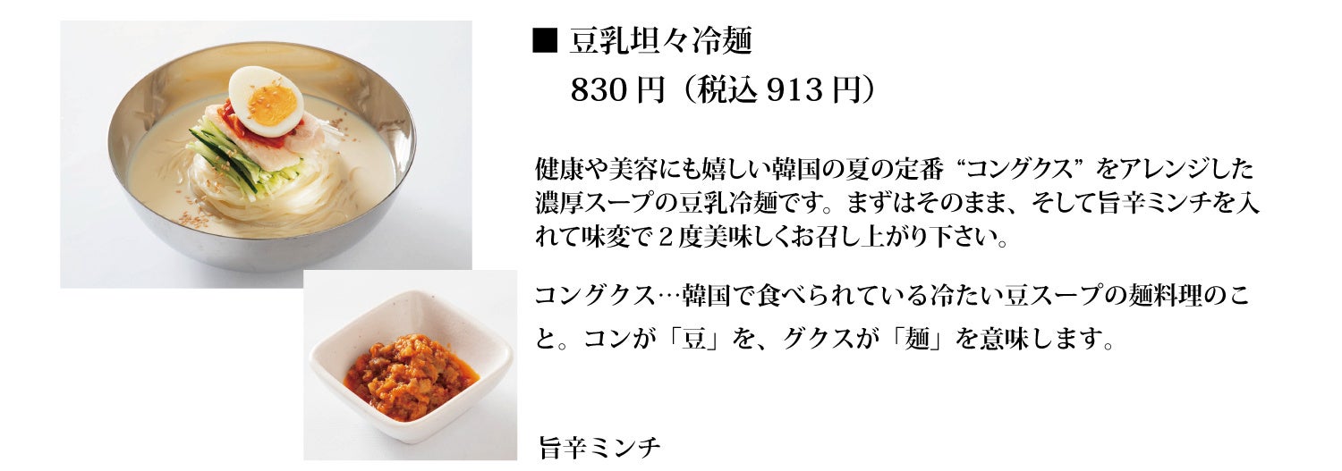 コチュジャンをベースにした旨辛ソースを使用し、辛さの中にも甘みがある「旨辛ビビン冷麺」に、韓国の夏の定番“コングクス”をアレンジした濃厚スープが決め手の「豆乳担々冷麺」。そして、期間限定セット「特製冷麺+ ハーフ石焼ビビンバセット」でございます。どうぞ期間限定の夏の韓流グルメをお楽しみください。皆様のご来店をスタッフ一同お待ちしております。
