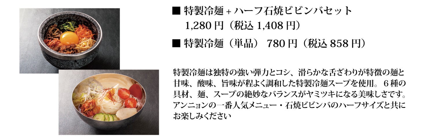 石焼ビビンバ専門店「アンニョン」では6月3日(火)より、「冷麺フェア」を開始いたします。