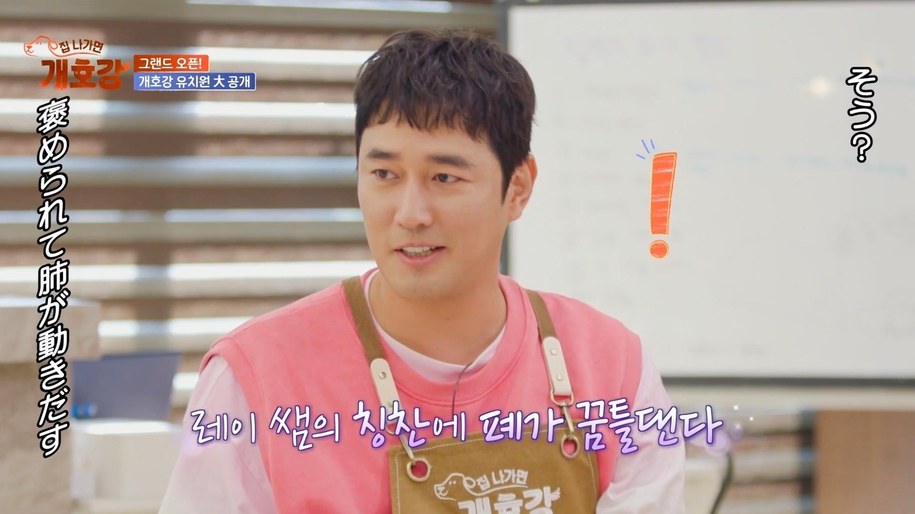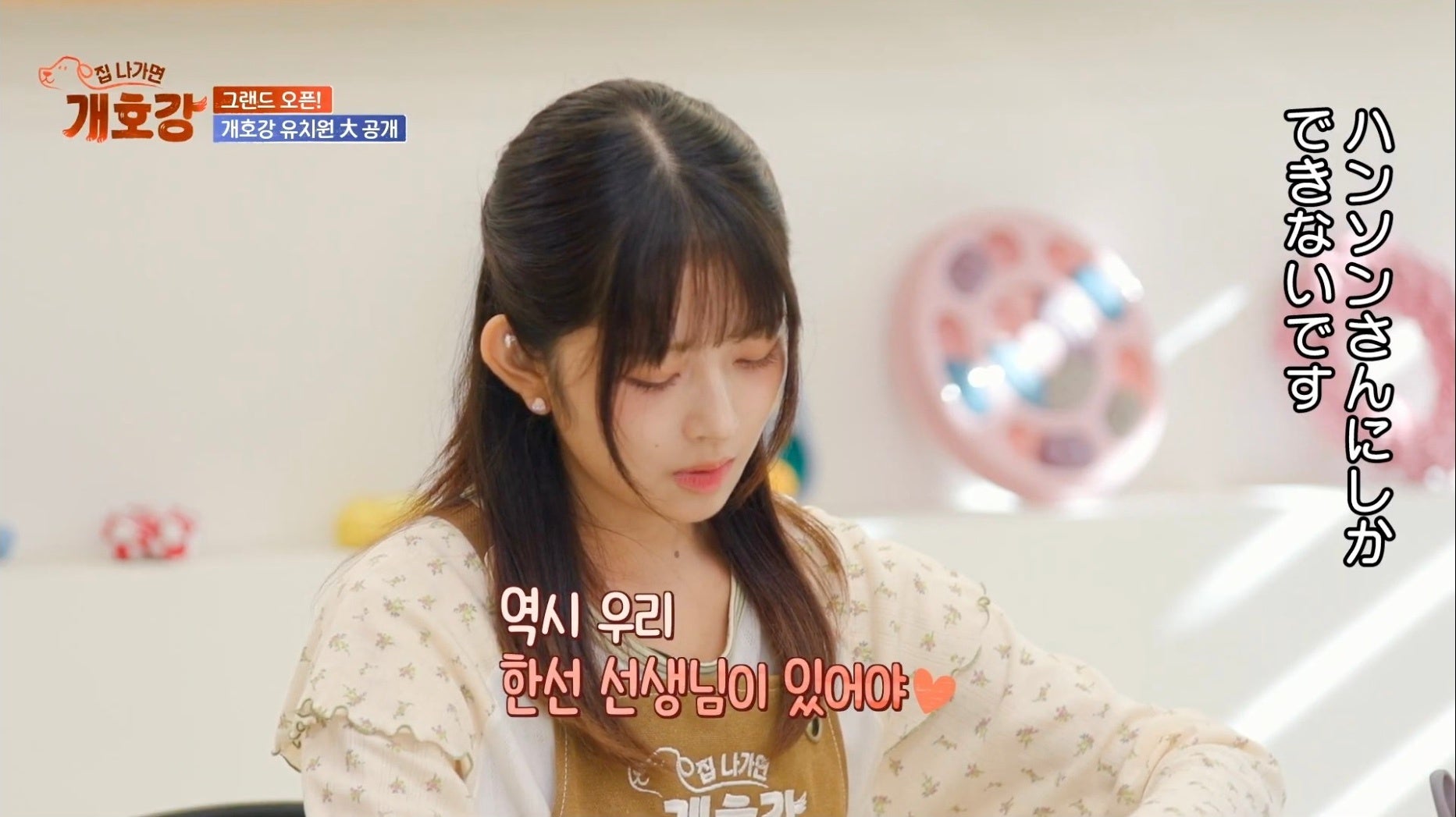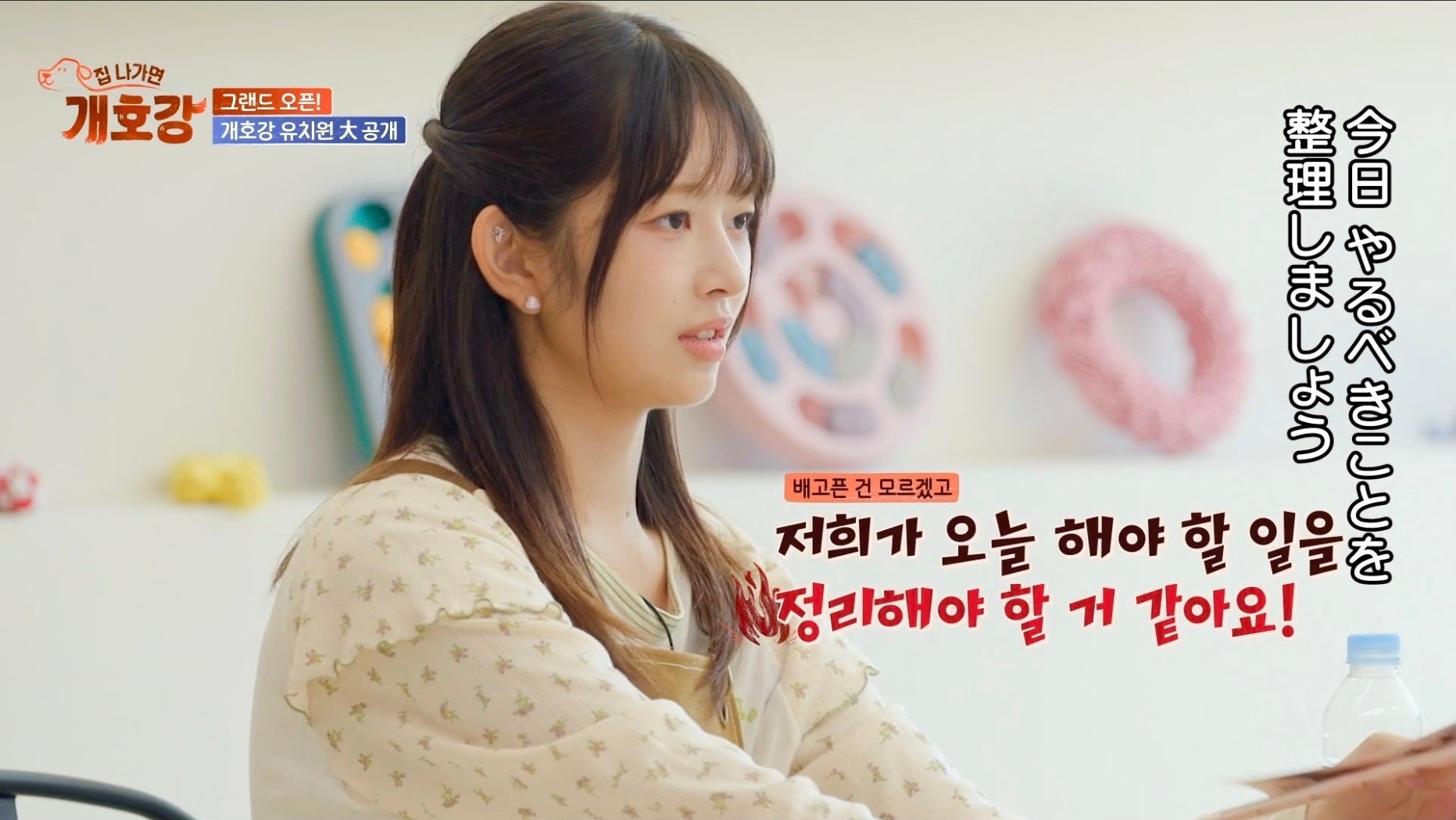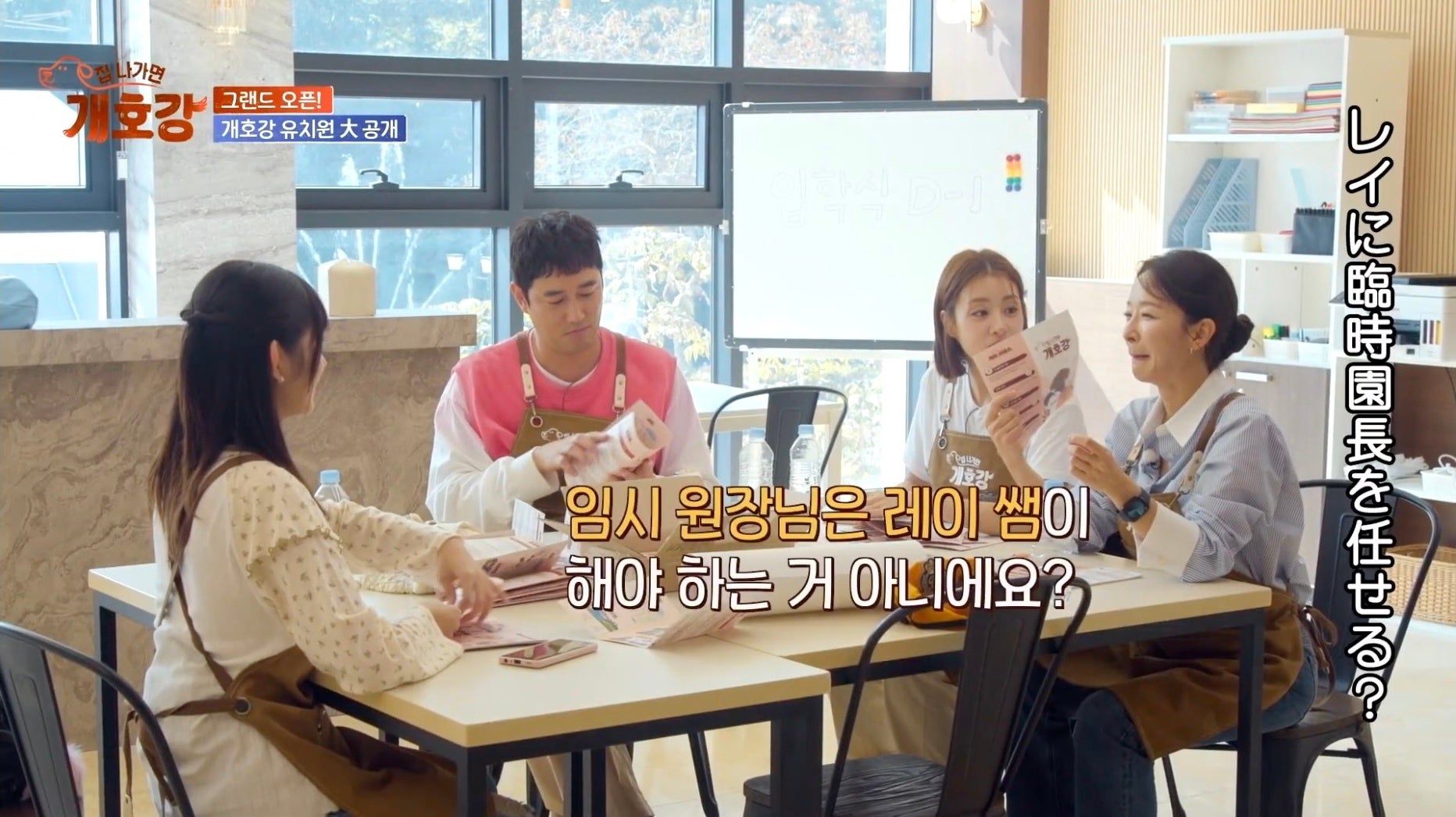 2025年5月31日(土)放送の第1話では、チョン・ヒョンム、カン・ソラ、チョ・ハンソン、パク・ソニョン、韓国の6人組ガールズグループ・IVEのレイが世界にたったひとつの“犬幼稚園”を設立するため集結。実家で犬を飼っているというレイは登場から犬好きをアピールし、迎えた開園前日、ヘルパードッグの大型犬・ストーリーとともに巨大な園内を巡ります。エプロンを身にまとい、ノリノリの一行は、翌日に控えた入園式の準備に。チョ・ハンソンは、「腹が減ったな」などと口にし、作業をサボろうとしますが、ここでレイが「今日やるべきことを整理しましょう。無計画にやっていたら日が暮れます」「無駄口はおしまい」とピシャリ。これにはカン・ソラ、パク・ソニョンも驚き「素直にものが言えて羨ましい」と口にし、さらにこの日園長のチョン・ヒョンムが不在だったことから「レイに臨時園長を任せる?」と冗談を飛ばしました。
