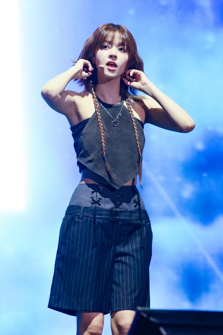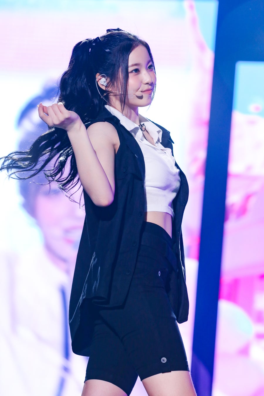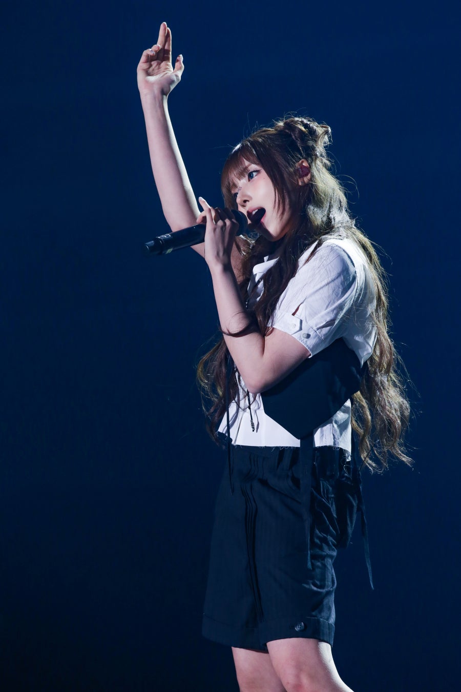 その後は、白と黒のスクールルック風衣装に着替え、ロック風にアレンジされた「Love Me Like This (Rock ver.)」(ラブ ミー ライク ディス ロック バージョン)を情熱的に歌い上げた。童謡を取り入れた「Young, Dumb, Stupid」(ヤング ダム ステューピッド)では、日本でミーム化している〝何が好き?〟風に「チョコミント~♡」と台詞を言って客席を沸かせた。センターステージいっぱいを使って大きなハートを描きながら披露したデビュー曲「O.O part.2」(オーオー パート ツー)では、メンバーの幸せそうな笑顔が印象的に残った。