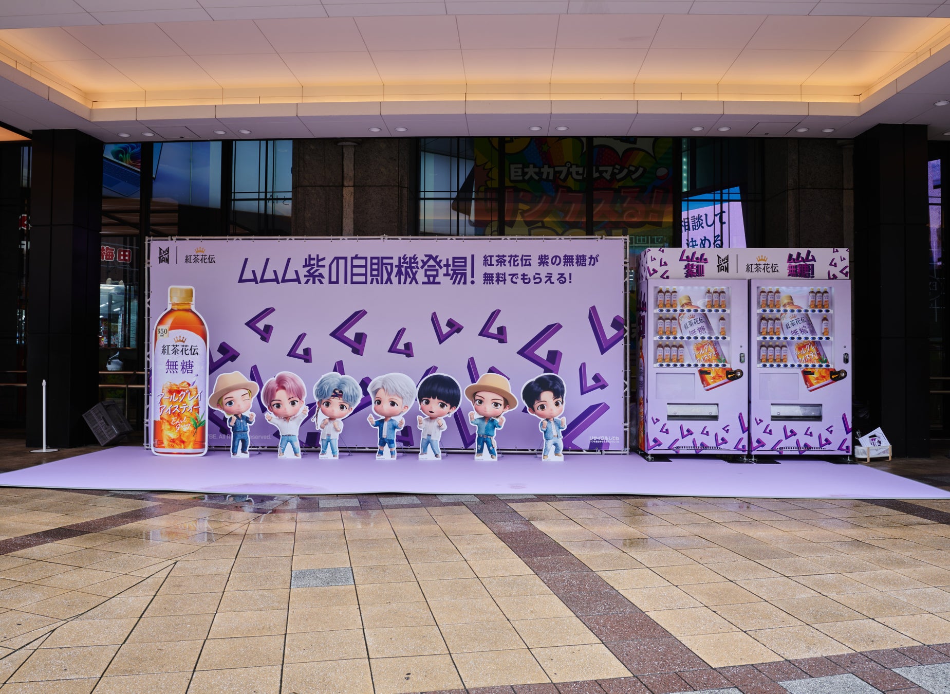 公約5では、「紅茶花伝 ムムム紫のTEAスタンド」イベントを、2025年6月14日(土)から開催する渋谷を皮切りに札幌、名古屋でも順次開催します。週末のお出かけにもぴったりな本イベントは、限定コラボボトルのパッケージデザインに描かれているような“紫のTEAスタンド”が登場し、「紅茶花伝」の“紫の無糖”のプレゼントと、一緒にお楽しみいただける「広瀬牧場 ウエモンズハート」のジェラートを販売します。さらに「TinyTAN」×「紅茶花伝」の夏限定コラボボトルがもらえる無料自動販売機が登場します。