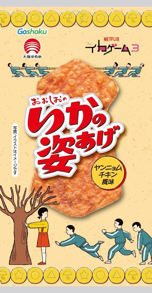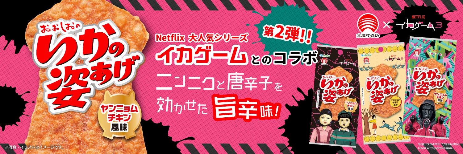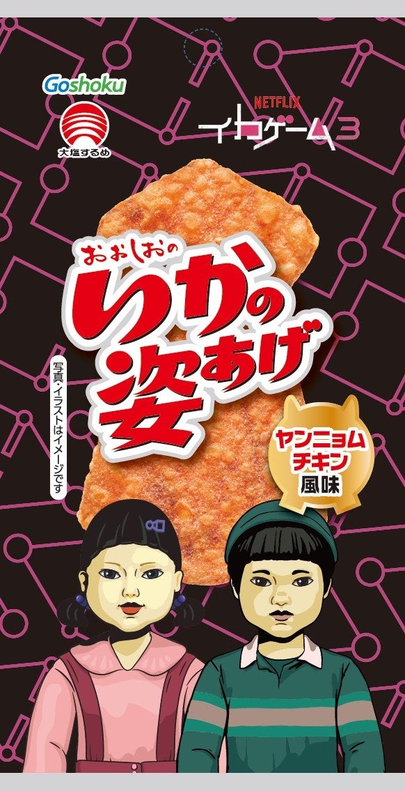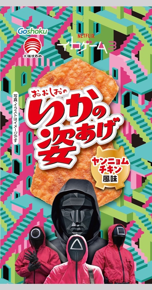 株式会社合食は、Netflixの世界的ヒットシリーズ「イカゲーム」とのコラボレーション第2弾として、「いかの姿あげ イカゲーム ヤンニョムチキン風味」を発売いたします。